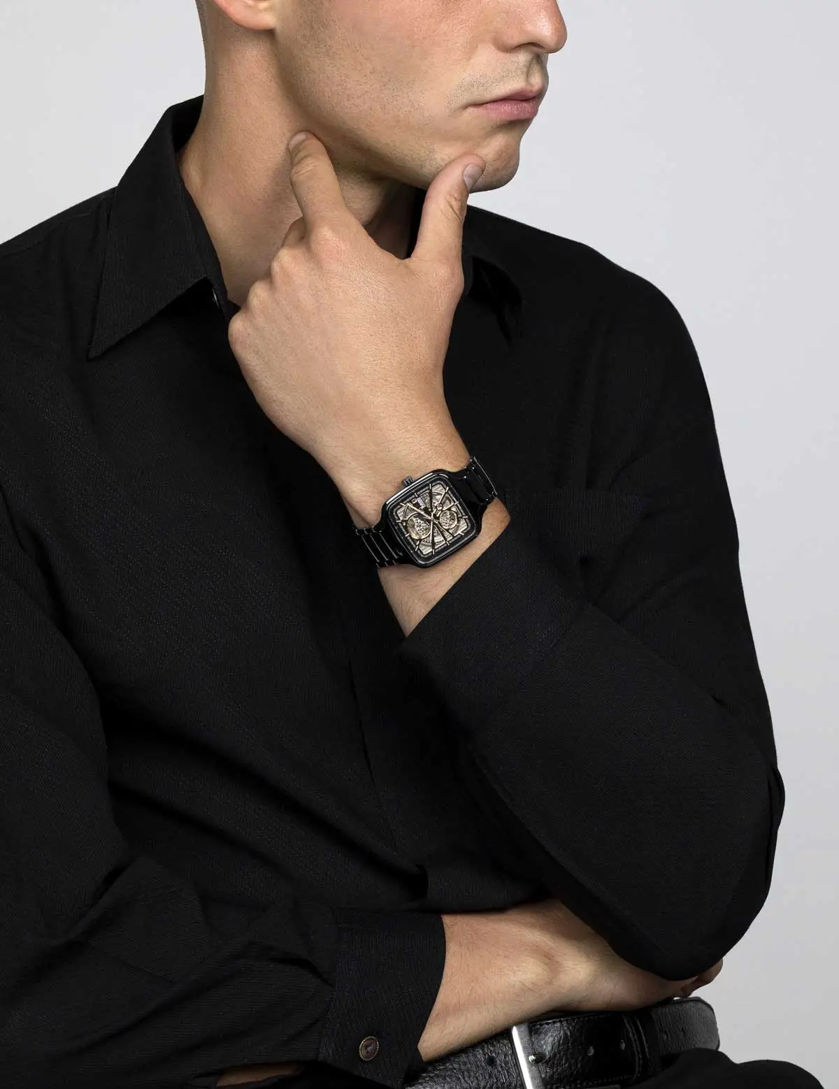 Die Rado True Square Automatic Open Heart R27086162 interpretiert das ikonische quadratische Design der Marke in moderner Form neu. Ihr 38-mm-Gehäuse aus High-Tech-Keramik ist leicht, hypoallergen und äußerst kratzfest. Das elegante schwarze Skelett-Zifferblatt mit offener Unruh („Open Heart“) gibt den Blick auf das Uhrwerk frei, während das Saphirglas dauerhafte Klarheit und Schutz bietet.