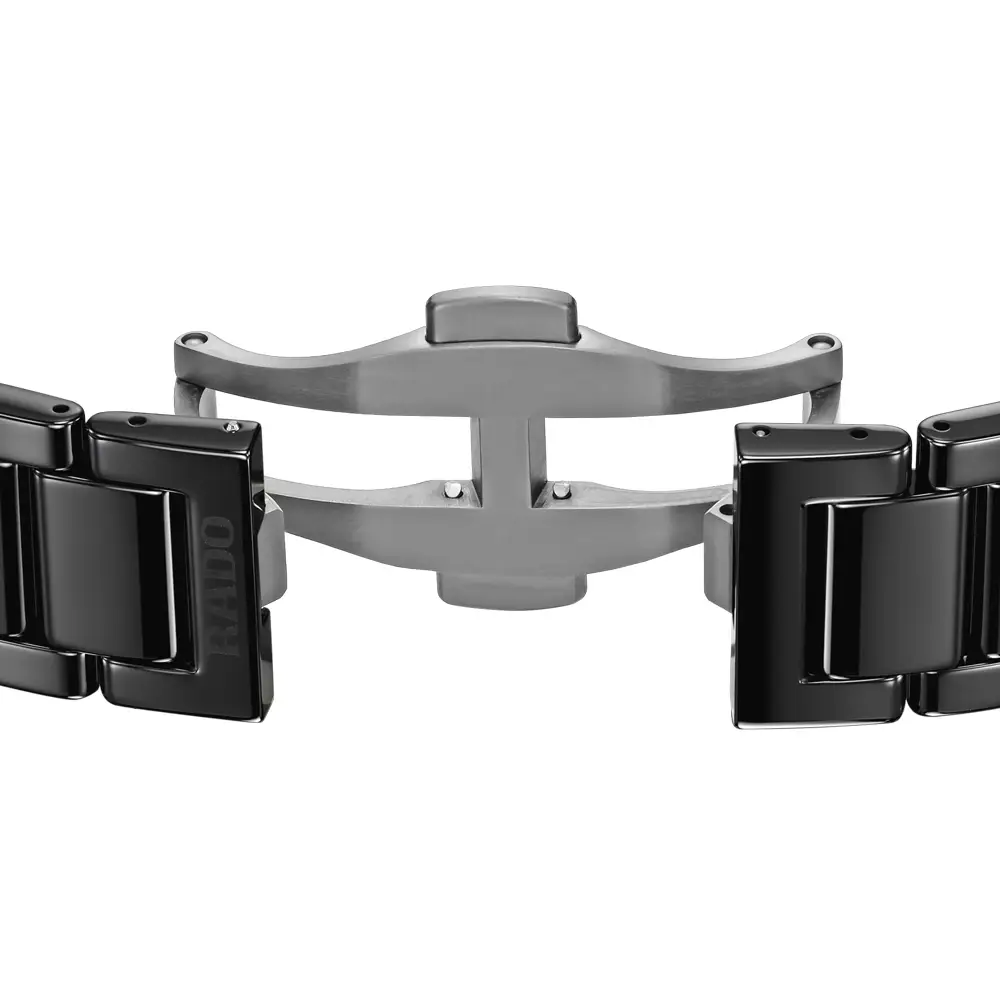 Die Rado True Square Thinline R27054152 vereint minimalistisches Design mit technischer Perfektion in einem schlanken und eleganten Format. Das eckige 37-mm-Gehäuse besteht aus hochwertiger schwarzer Keramik, die leicht, kratzfest und hypoallergen ist.