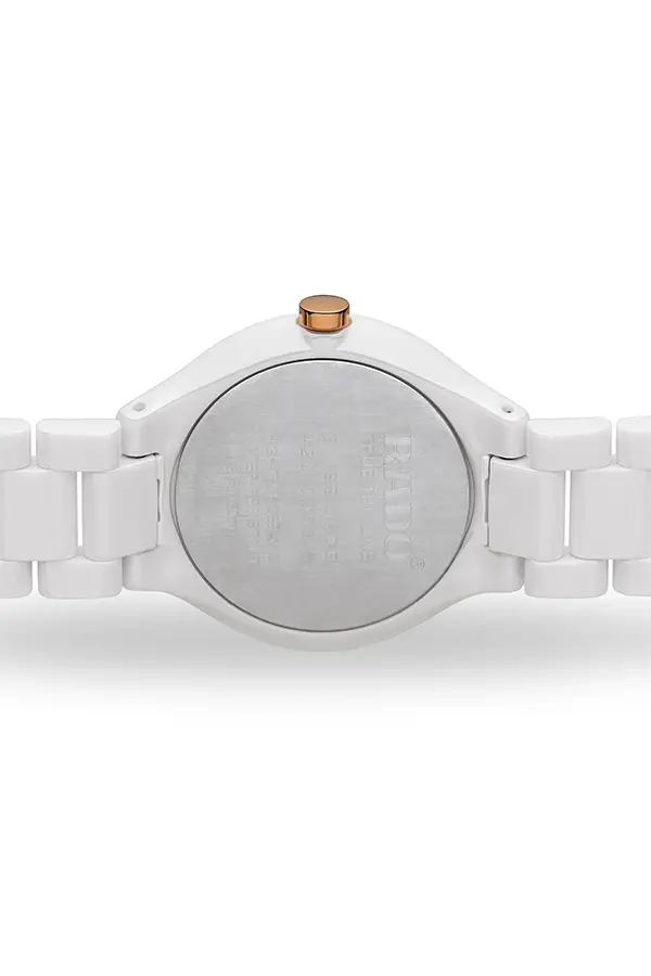 Das integrierte weiße Keramikarmband fügt sich nahtlos in das Gehäuse ein und bietet höchsten Tragekomfort. Mit einer Wasserdichtigkeit von 30 m (3 ATM) eignet sich die Uhr perfekt für den Alltag. Die Rado True Thinline R27958722 steht für moderne Weiblichkeit, Leichtigkeit und zeitloses Design – ideal für Liebhaberinnen dezenter Eleganz.