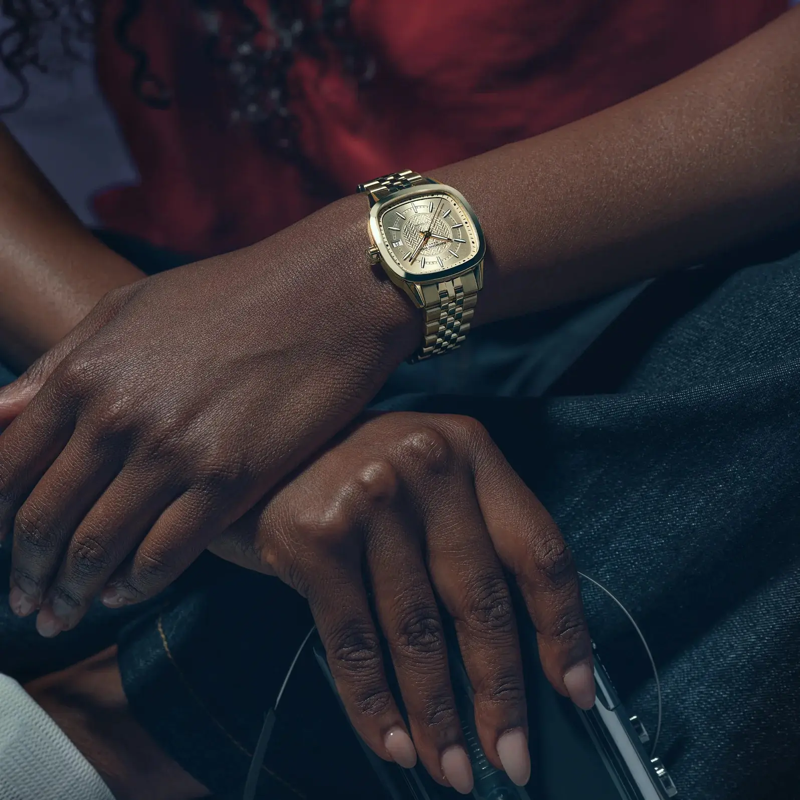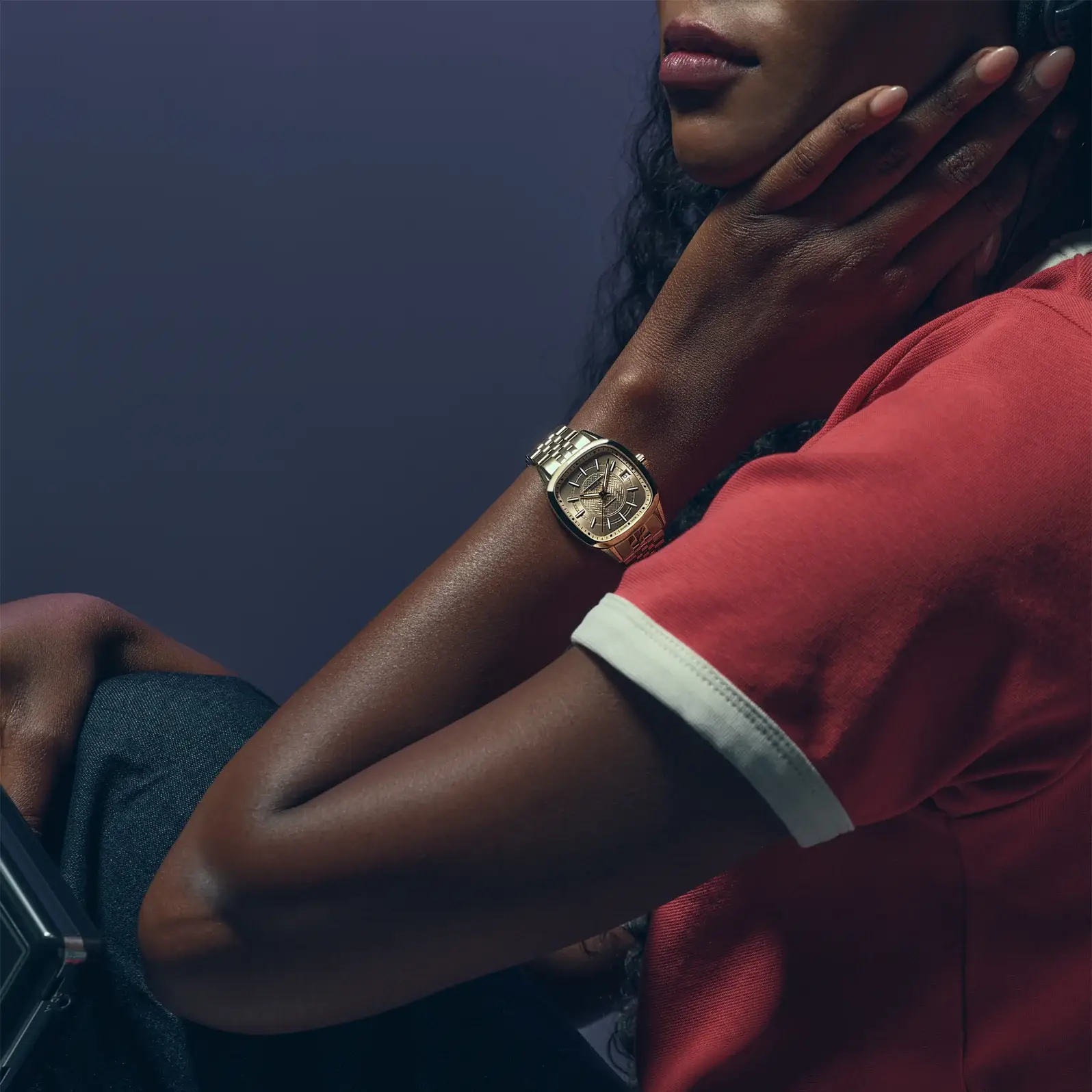 Ein Edelstahlarmband mit vergoldeten Gliedern und einer Doppeldrücker-Faltschließe rundet das Design ab. Mit einer Höhe von nur 9,3 mm trägt sich die Uhr angenehm und stilvoll – perfekt für den Alltag ebenso wie für besondere Anlässe.