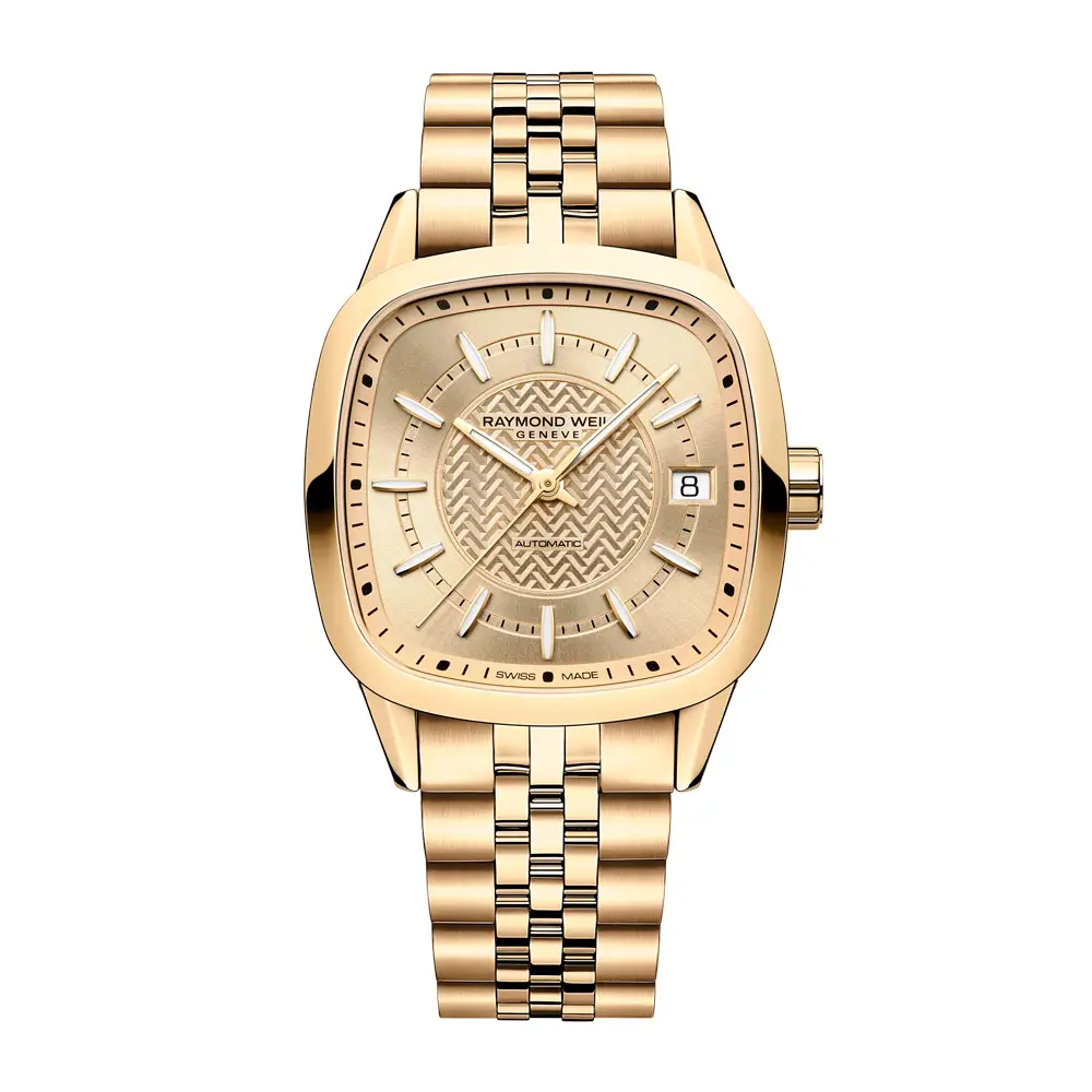 Die Raymond Weil Freelancer 2490-P-10051 vereint traditionelle Schweizer Uhrmacherkunst mit modernem Design. Das 34×34 mm Cushion-Gehäuse aus Edelstahl mit gelber PVD-Beschichtung umrahmt ein Champagner-Zifferblatt mit feinem W-Guilloché. Mit Super-Luminova® beschichtete Zeiger und Indizes garantieren beste Ablesbarkeit.