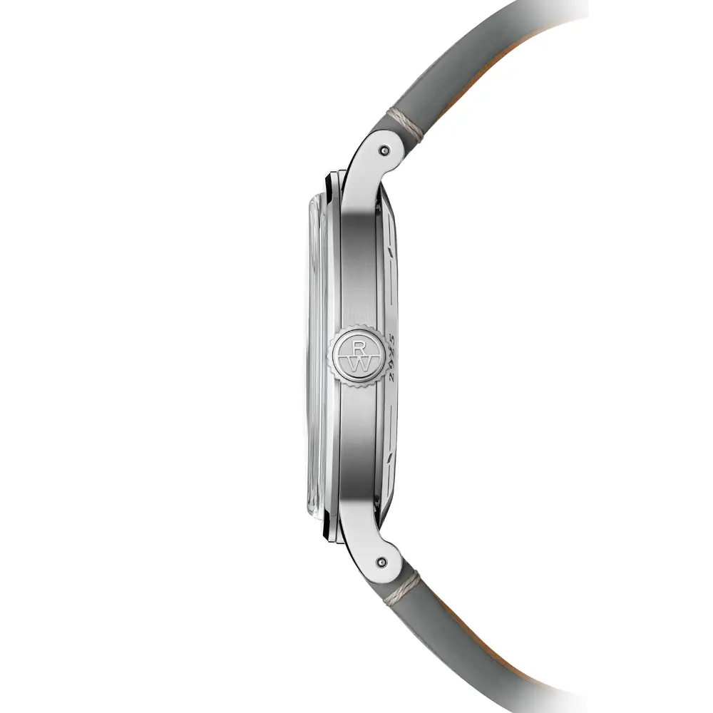 Das Armband besteht aus echtem grauen Leder und verfügt über eine traditionelle Edelstahl-Dornschließe. Die Uhr ist bis 50 Meter wasserdicht, was sie für den täglichen Gebrauch und leichte Wasseraktivitäten geeignet macht.
