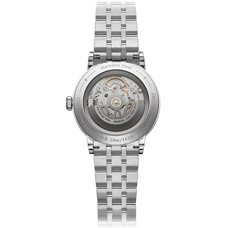 Im Inneren arbeitet das automatische Kaliber RW4251 mit einer Gangreserve von 41 Stunden, das präzise und zuverlässig läuft. Durch den transparenten Saphirglasboden lässt sich der verzierte Rotor mit dem Raymond Weil-Emblem bewundern – ein Ausdruck feinster Schweizer Handwerkskunst. Mit einer Wasserdichtigkeit bis 50 Meter eignet sich die Uhr sowohl für den Alltag als auch für elegante Anlässe.