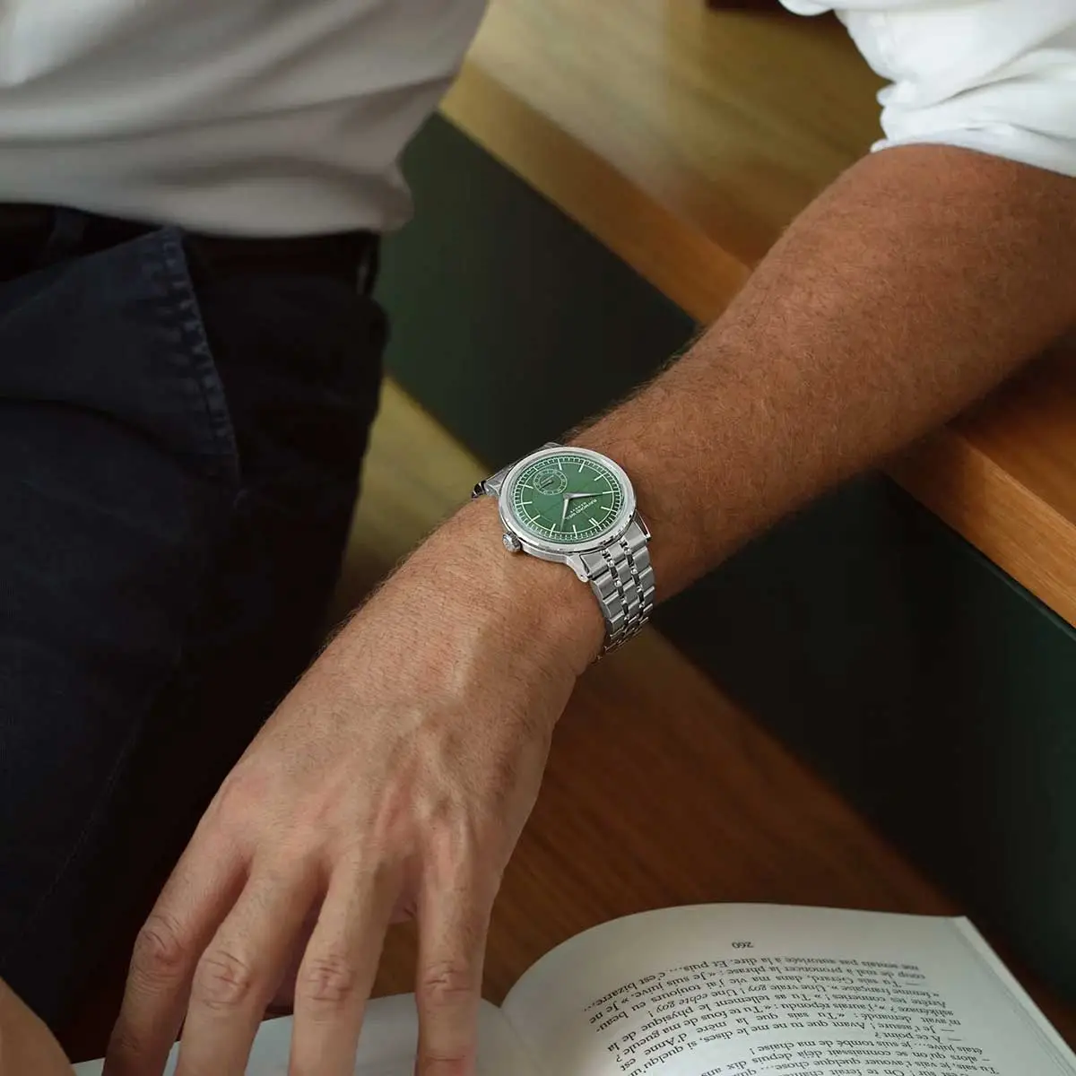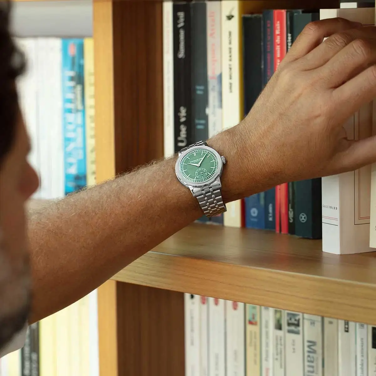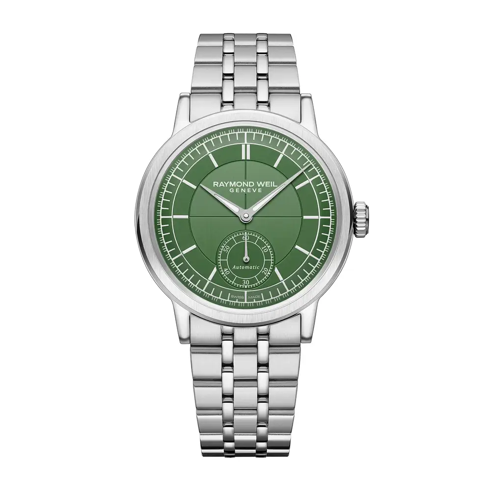 Die Raymond Weil Millesime 2930-ST-52001 vereint Vintage-Ästhetik und moderne Eleganz in perfekter Harmonie. Das 39,5 mm Edelstahlgehäuse ist mit einem gewölbten Saphirglas mit Antireflexbeschichtung versehen, das den charakteristischen „Glassbox“-Effekt erzeugt. Das grüne Sektor-Zifferblatt mit feinen Oberflächenstrukturen verfügt über ein Hilfszifferblatt für die kleine Sekunde bei 6 Uhr, das dem Design Tiefe und Balance verleiht.