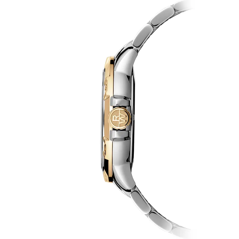 Die Raymond Weil Tango 8160-STP-00308 vereint klassisches zweifarbiges Design, schweizerische Präzision und zeitlose Eleganz. Das 41 mm Edelstahlgehäuse mit gelbgoldener PVD-Beschichtung ist durch kratzfestes Saphirglas geschützt. Das weiße Zifferblatt mit goldenen römischen Ziffern, Zeigern und einem Datumsfenster bei 3 Uhr verleiht der Uhr ein harmonisches und edles Erscheinungsbild.