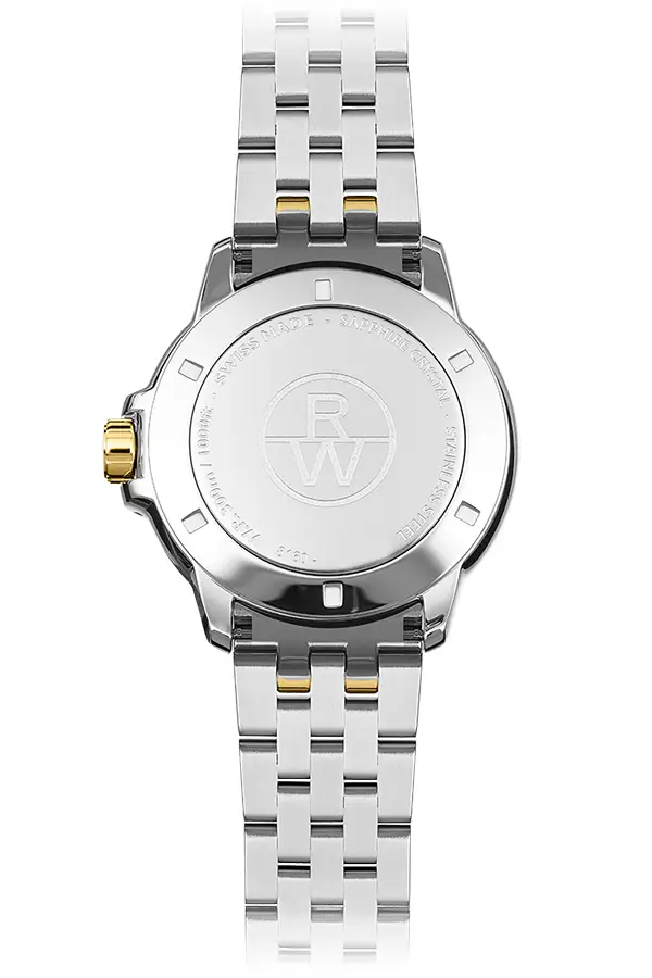 Das zweifarbige Armband aus Edelstahl und goldener PVD-Beschichtung schließt harmonisch an das Gehäuse an und wird mit einer Faltschließe mit doppeltem Sicherheitsdrücker gesichert. Die Raymond Weil Tango Two-Tone 8160-STP-00508 ist die perfekte Wahl für Herren, die zeitloses Design, dezenten Luxus und echte Schweizer Handwerkskunst schätzen.