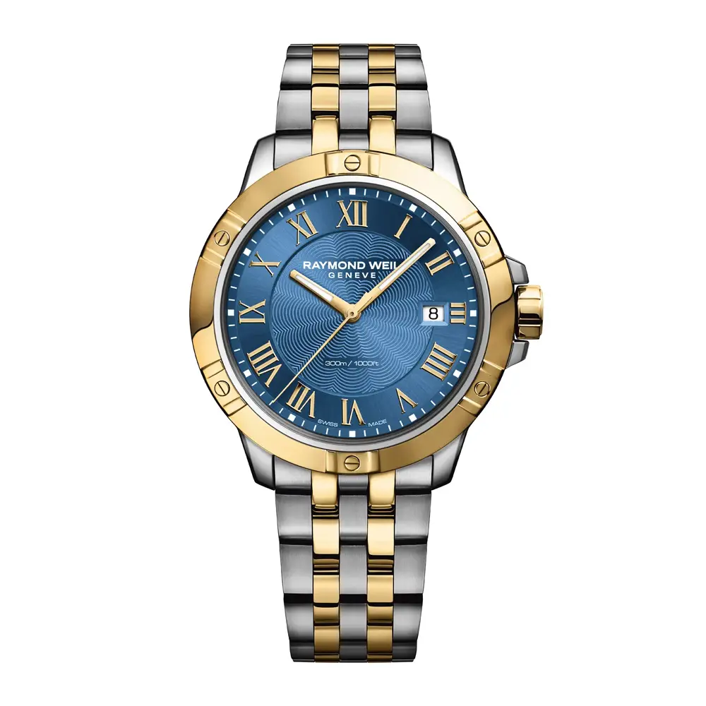 Die Raymond Weil Tango Two-Tone 8160-STP-00508 vereint klassische Eleganz, modernes Design und schweizerische Präzision. Das 41 mm Edelstahlgehäuse ist mit einer gelbgoldenen PVD-Beschichtung veredelt, die den zweifarbigen Charakter des Modells betont. Das tiefblaue Zifferblatt mit römischen Ziffern und Datumsfenster bei 3 Uhr bildet einen eleganten Kontrast zu den goldenen Details und verleiht der Uhr einen zeitlosen, edlen Look.