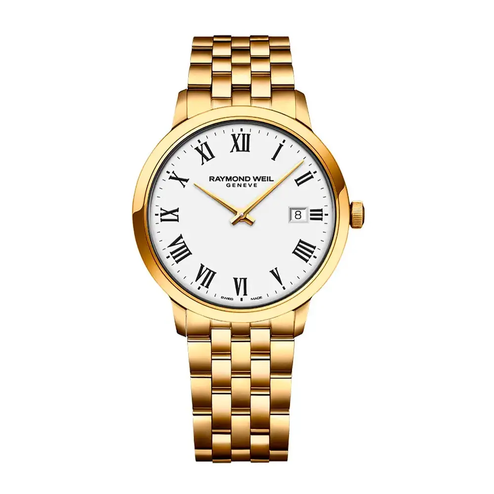 Die Raymond Weil Toccata 5485-P-00300 ist eine elegante Herrenuhr, die zeitloses Design mit modernen Elementen kombiniert. Die Uhr ist mit einem Quarzwerk ausgestattet, das Präzision und Zuverlässigkeit gewährleistet. Sie hat ein 39mm Gehäuse, das mit gelbgoldenem PVD beschichtet ist, was ihr ein luxuriöses Aussehen verleiht. Das Zifferblatt ist weiß mit schwarzen römischen Ziffern und einem Datumsfenster bei drei Uhr, was den klassischen Stil und die einfache Ablesbarkeit unterstreicht.