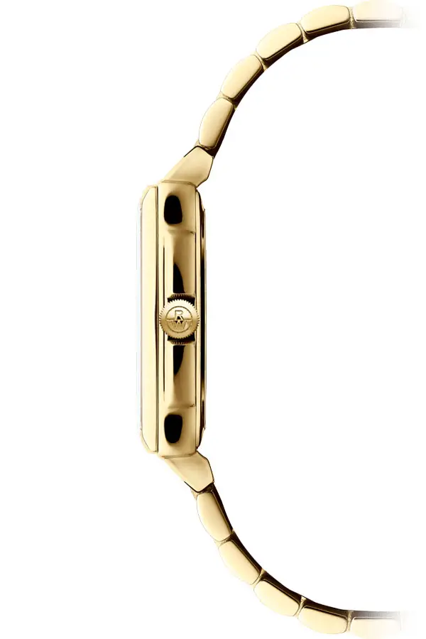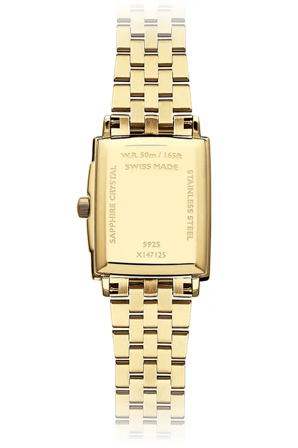Das rechteckige Edelstahlgehäuse mit Gelbgoldbeschichtung misst 23,4 × 34,6 mm. Das kratzfeste Saphirglas schützt das Zifferblatt, während die Wasserdichtigkeit von 5 ATM / 50 Metern die Uhr alltagstauglich macht.