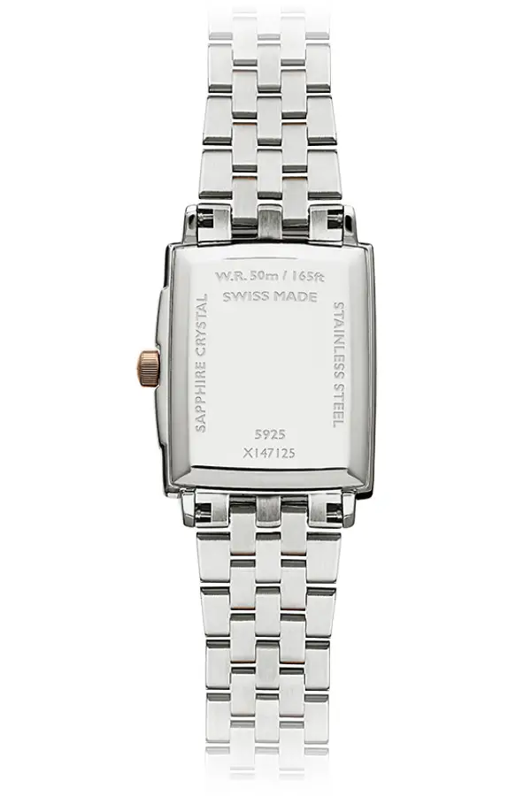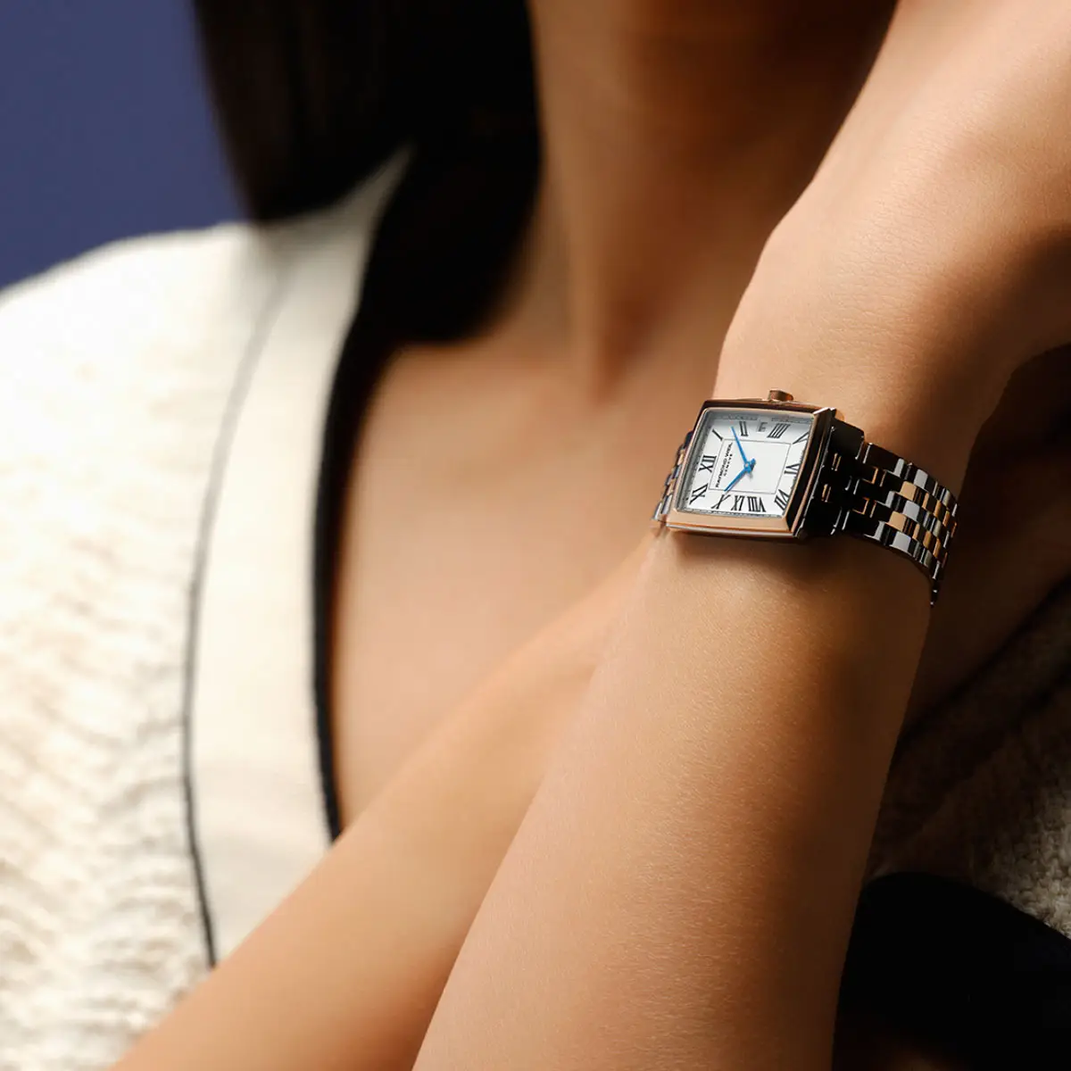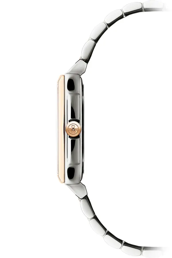 Das Armband der Uhr ist zweifarbig und kombiniert Edelstahl mit rosévergoldeten PVD-Gliedern. Es wird mit einer Faltschließe geschlossen, die ein bequemes und sicheres Tragen ermöglicht. Die Uhr ist bis zu 50 Meter wasserdicht, was für den täglichen Gebrauch und leichte Wasseraktivitäten geeignet ist.