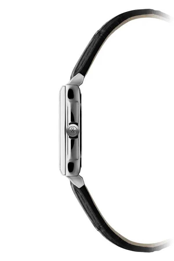 Das Modell wird mit einem schwarzen Kalbslederarmband geliefert, das durch eine Edelstahldornschließe gesichert ist. Mit einer Wasserdichtigkeit von 50 Metern (5 ATM) eignet sich die Uhr perfekt für den täglichen Gebrauch und bleibt dennoch ein Symbol schlichter Raffinesse.