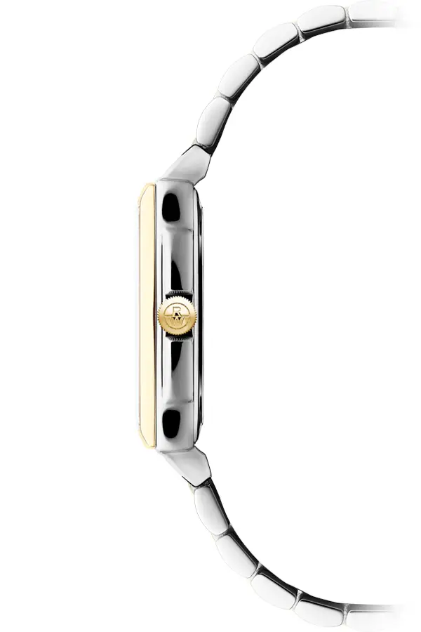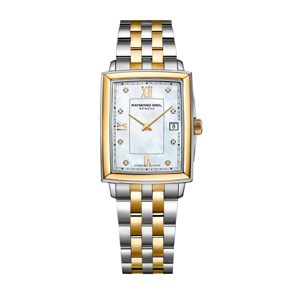 Die Raymond Weil Toccata 5925-STP-00995 verkörpert Art-Déco-Eleganz, feminine Raffinesse und schweizerische Präzision. Das rechteckige Gehäuse (22,6 × 28,1 mm) aus Edelstahl mit goldener PVD-Beschichtung ist mit kratzfestem Saphirglas versehen. Das Perlmutt-Zifferblatt, geschmückt mit 8 Diamantindizes und römischen Ziffern, strahlt luxuriöse Zeitlosigkeit aus.
