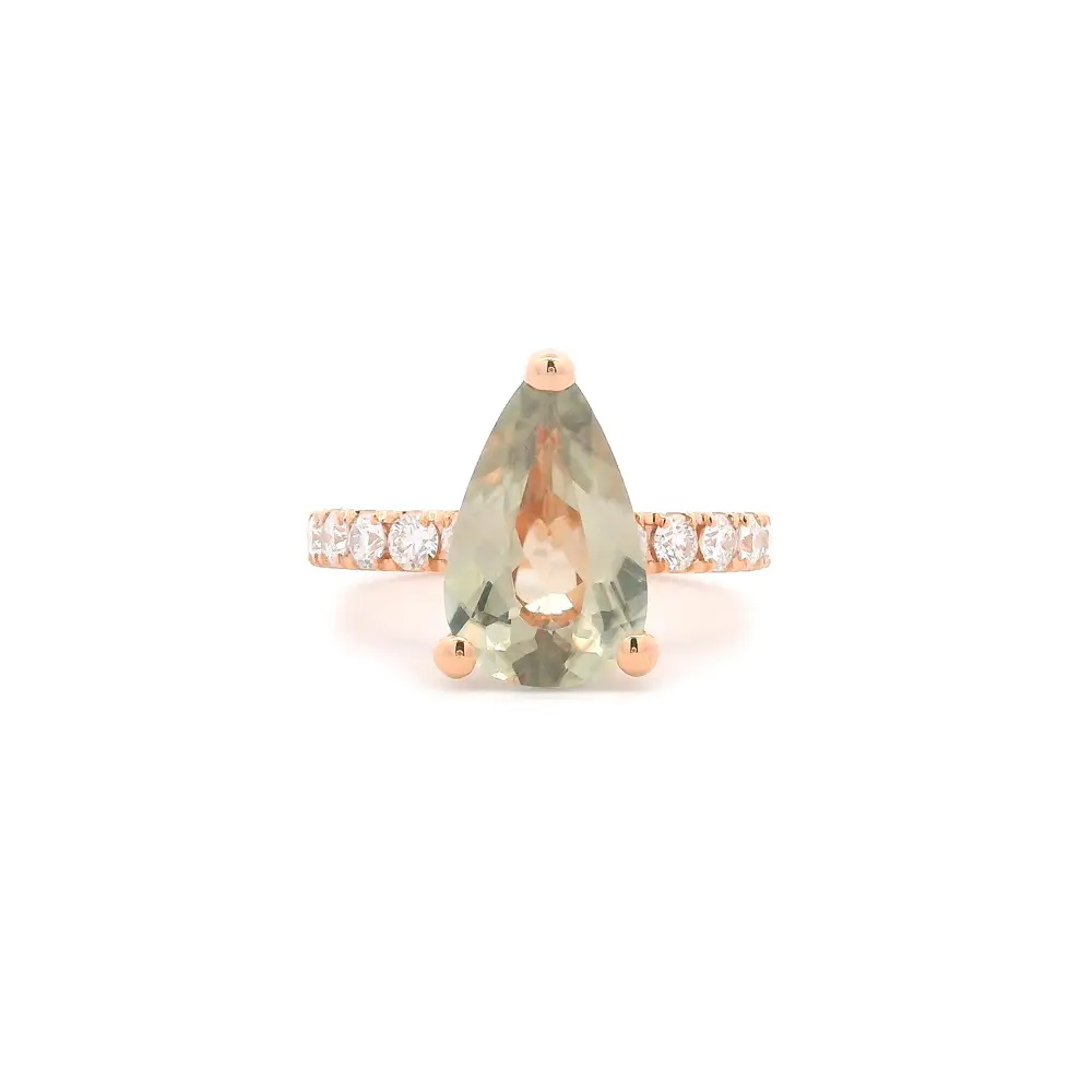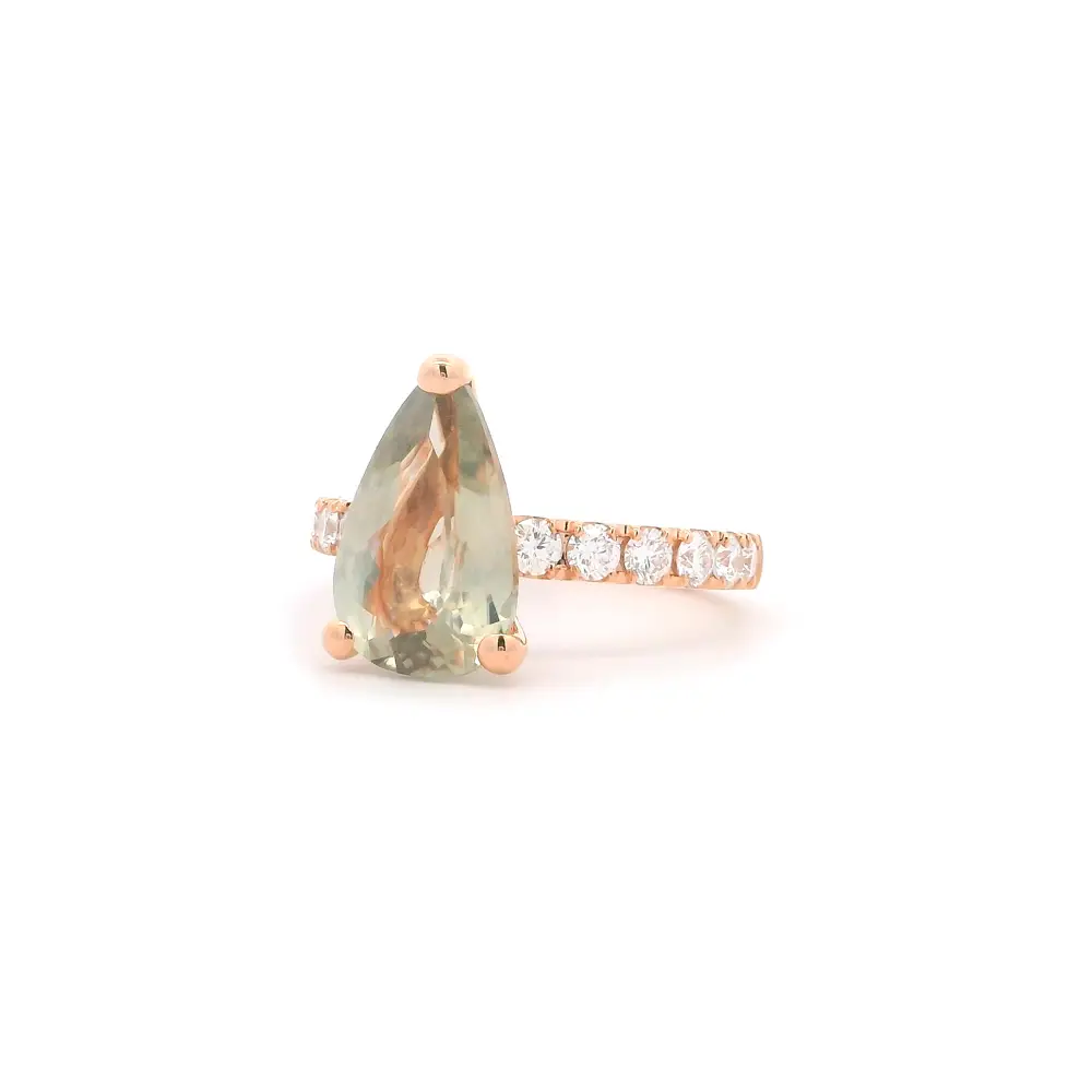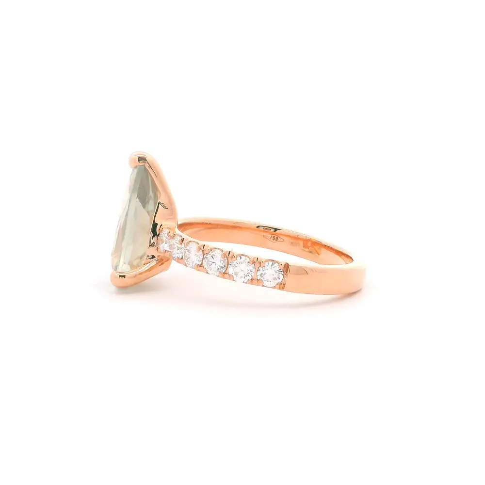 Dieser elegante Ring ist aus 18kt Roségold gefertigt und trägt einen markanten Turmalin im Tropfenschliff. Der zarte Farbton des Edelsteins wirkt raffiniert und kommt in der zentralen Fassung, gehalten von drei Krappen, perfekt zur Geltung.