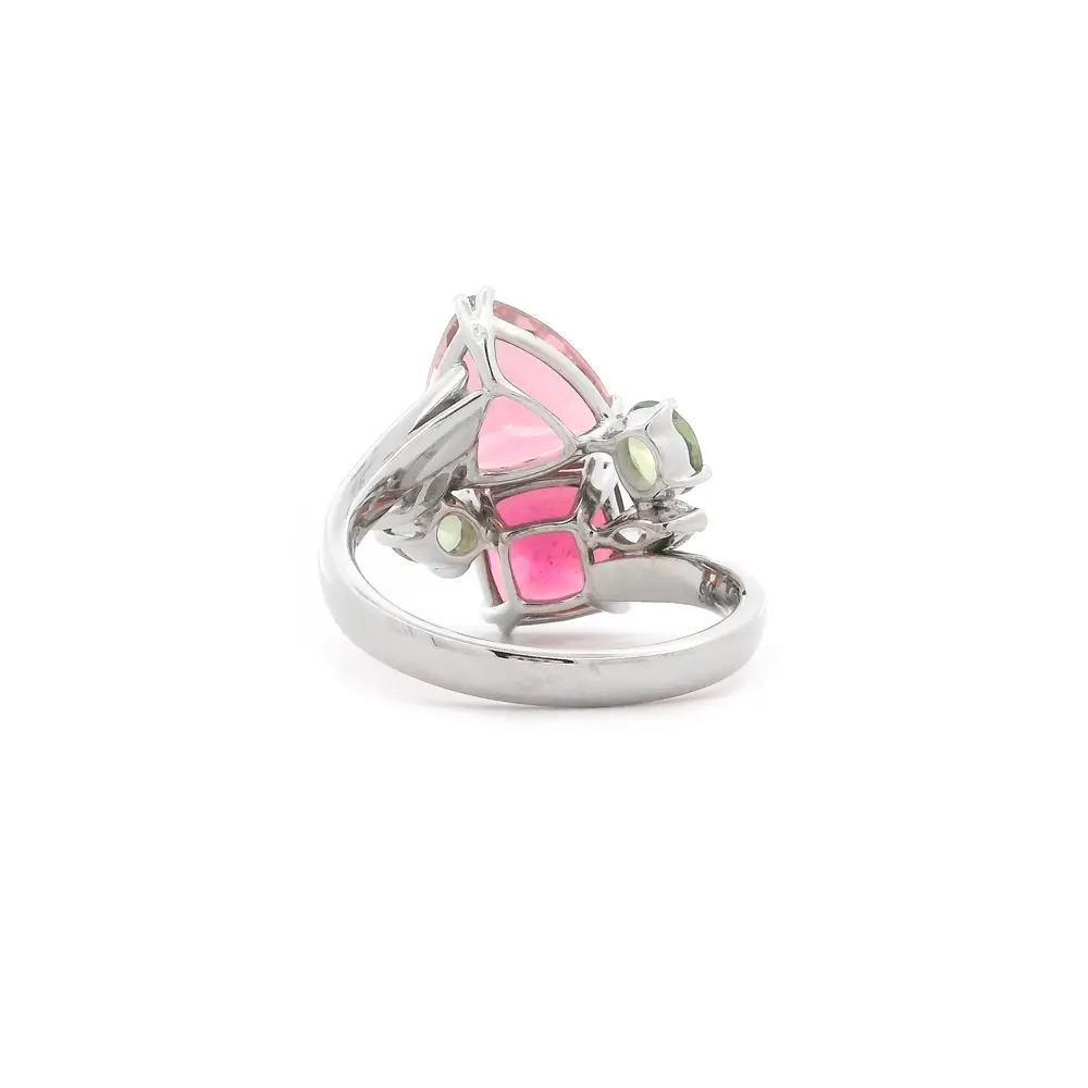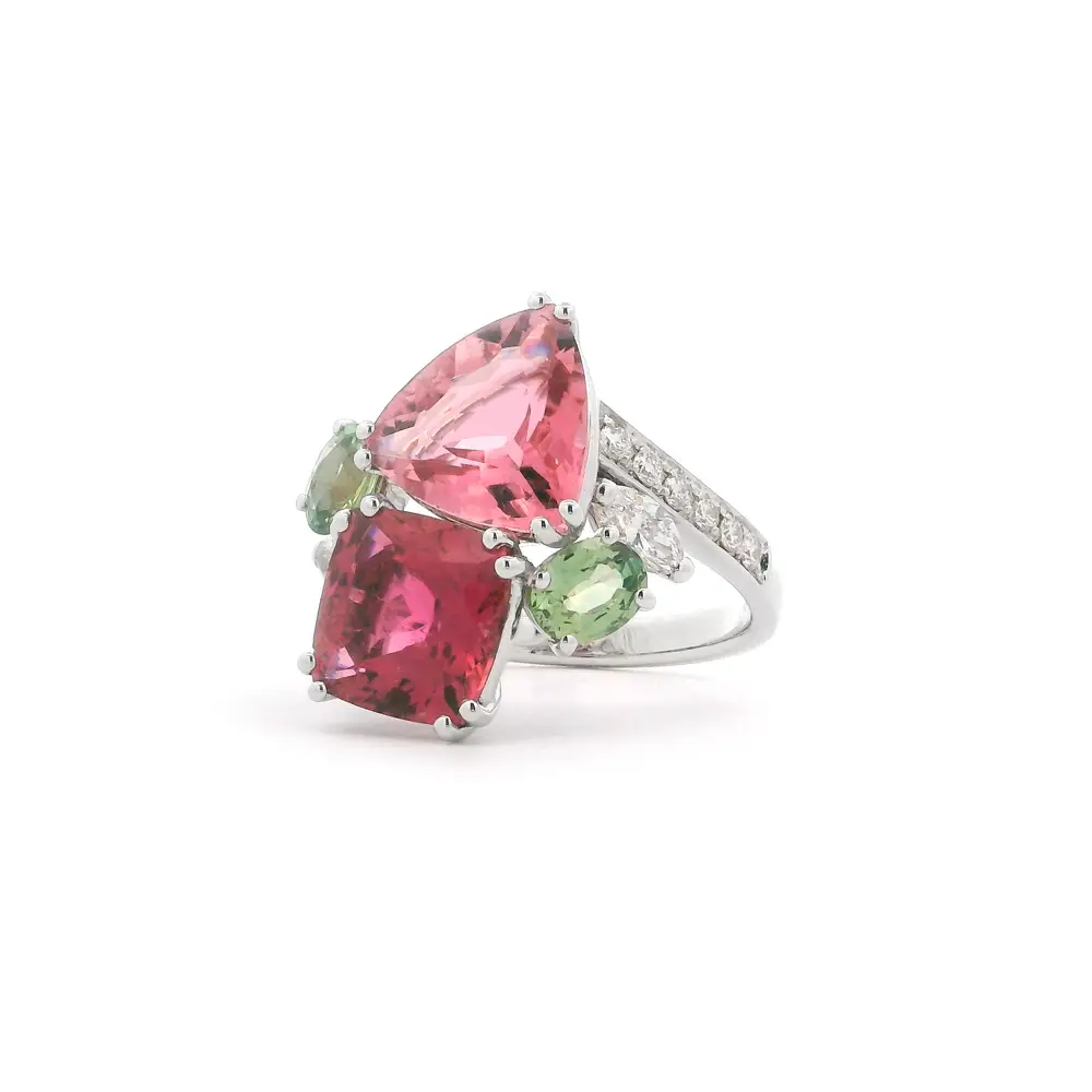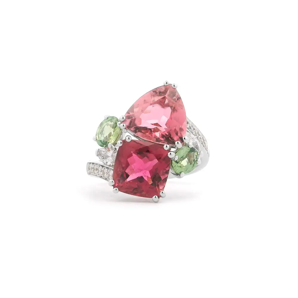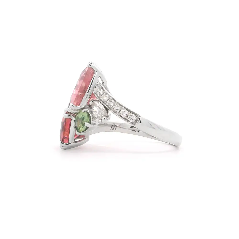 Dieser bezaubernde Ring ist aus 18kt Weißgold gefertigt und fasziniert durch sein Spiel von Farben und Formen. Im Mittelpunkt stehen zwei auffällige Turmaline in Rosétönen, die in ungewöhnlichen Schliffen erstrahlen und sofort ins Auge fallen.