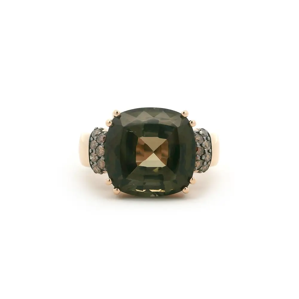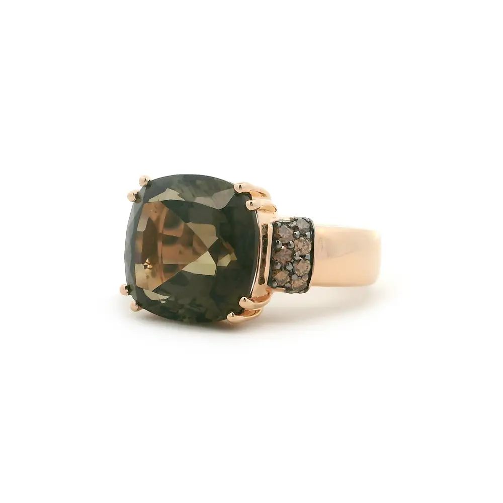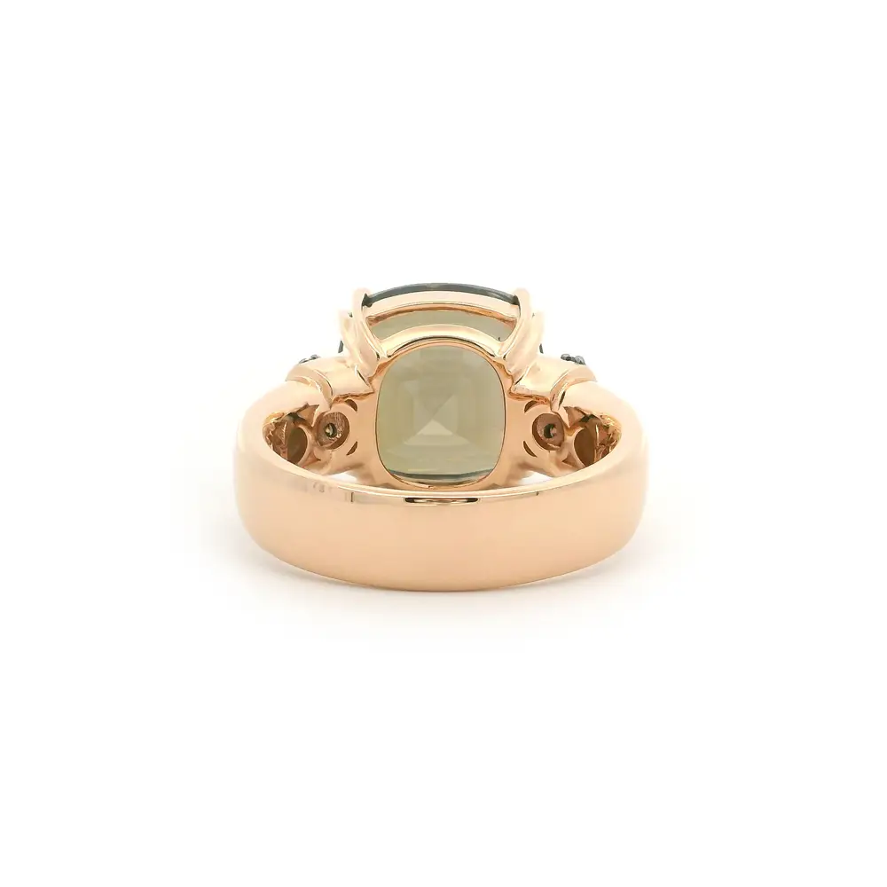 Dieser elegante Ring aus 18 Karat Roségold besticht durch seine harmonische Verbindung warmer Farbtöne. Im Mittelpunkt steht ein großer, kissenförmig geschliffener grüner Turmalin, dessen Tiefe und Glanz perfekt mit dem sanften Goldton harmonieren. Die braunen Diamanten an den Seiten verleihen dem Schmuckstück zusätzliche Wärme und einen Hauch von Luxus.