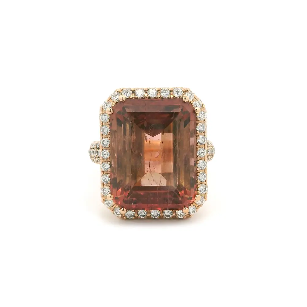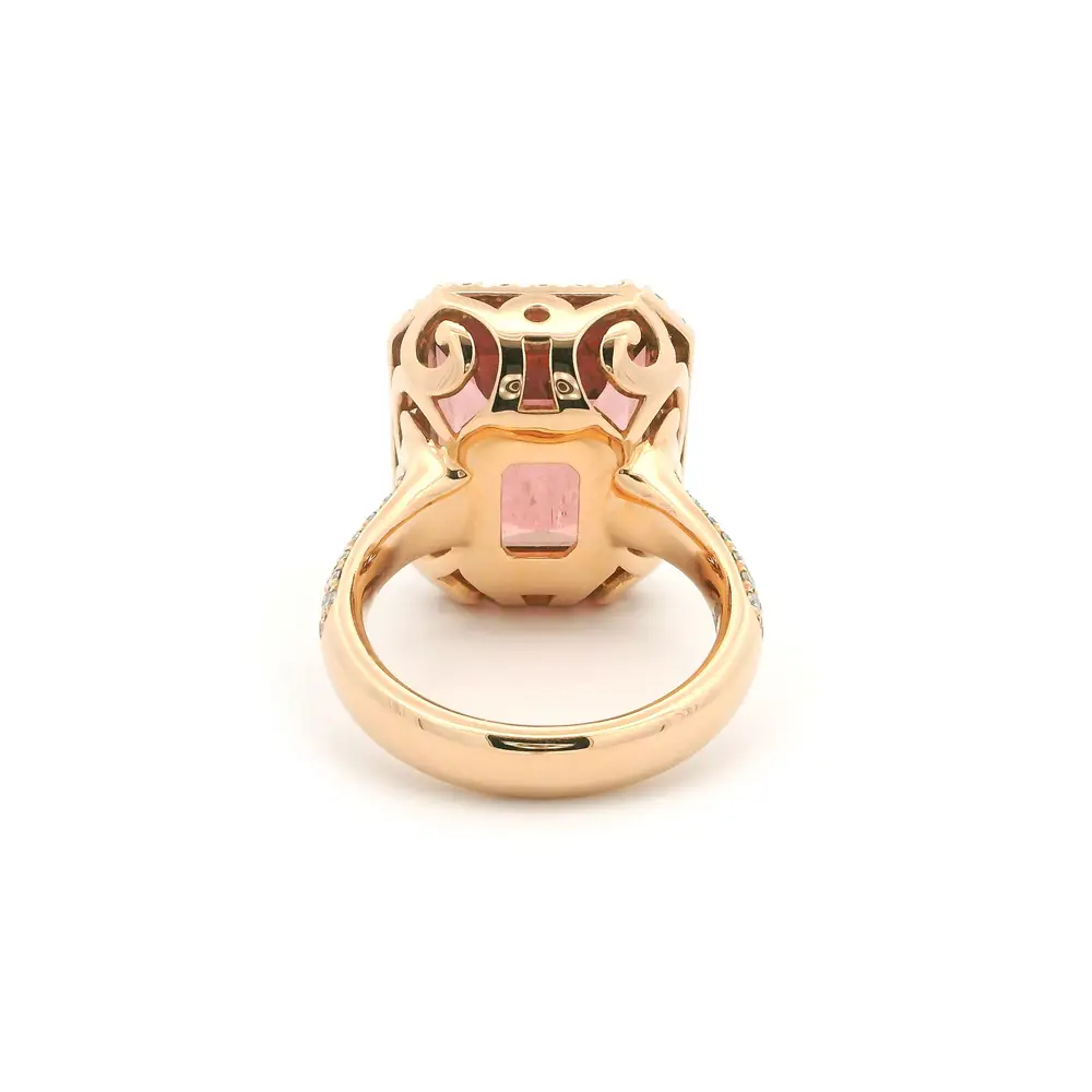 Dieser elegante Ring aus 18 Karat Roségold verkörpert feminine Raffinesse und zeitlose Schönheit. Im Mittelpunkt erstrahlt ein rechteckig geschliffener rosa Turmalin, dessen warme Farbtöne und natürlicher Glanz das Licht bei jeder Bewegung einfangen.