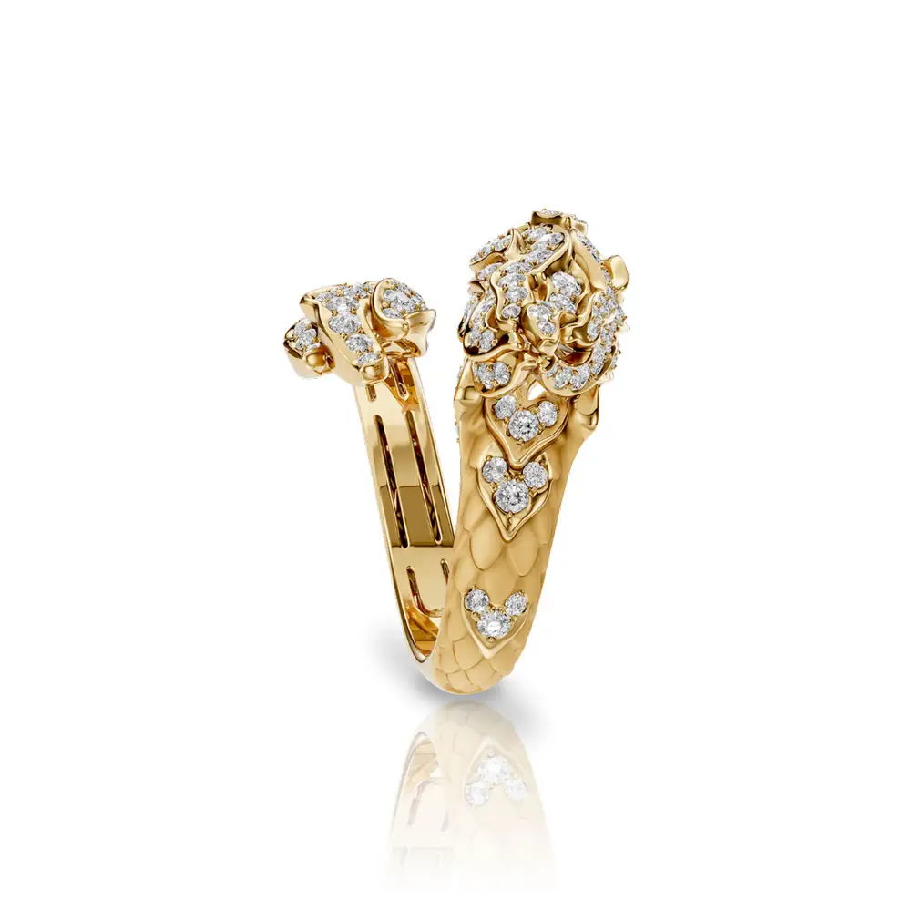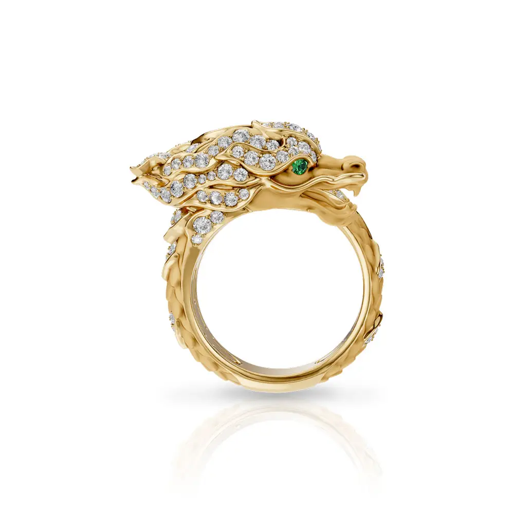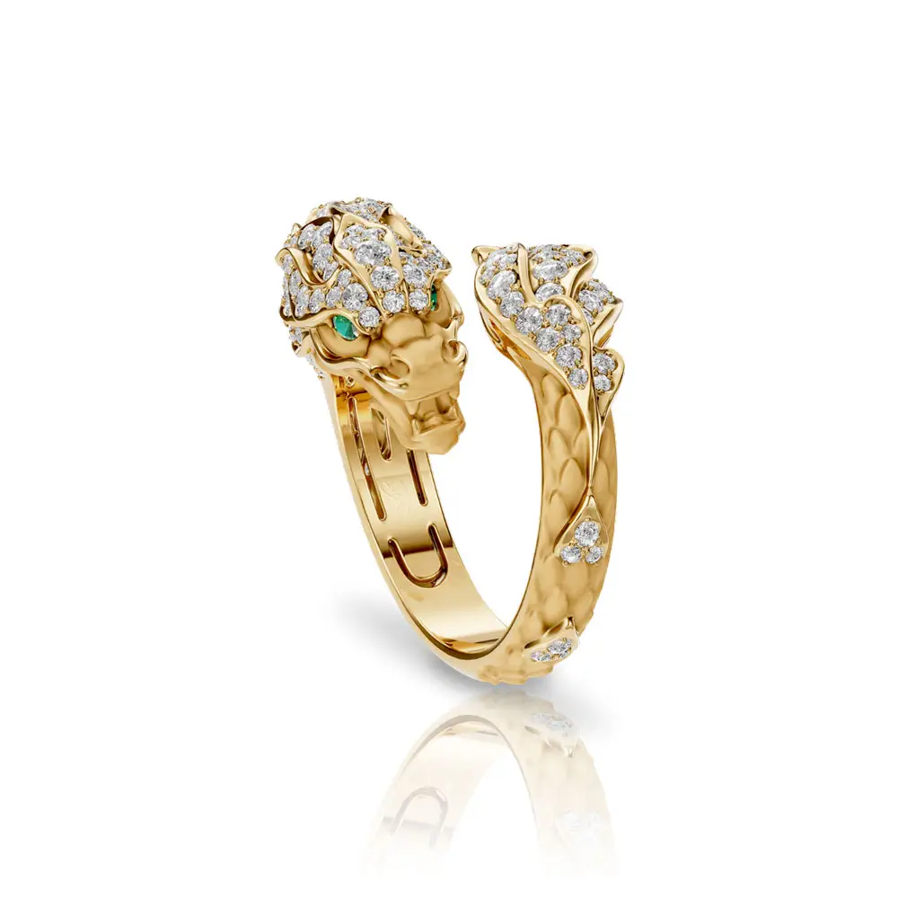 Sein Körper ist mit 125 Brillanten mit einem Gesamtgewicht von 1,44 Karat besetzt, die das skulpturale Design und die Präzision der einzelnen Schuppen hervorheben. Grüne Diamanten mit einem Gewicht von 0,06 Karat, die wie die Augen eines Drachens gefasst sind, verleihen dem Schmuckstück ein fesselndes Aussehen voller Energie und Leben.