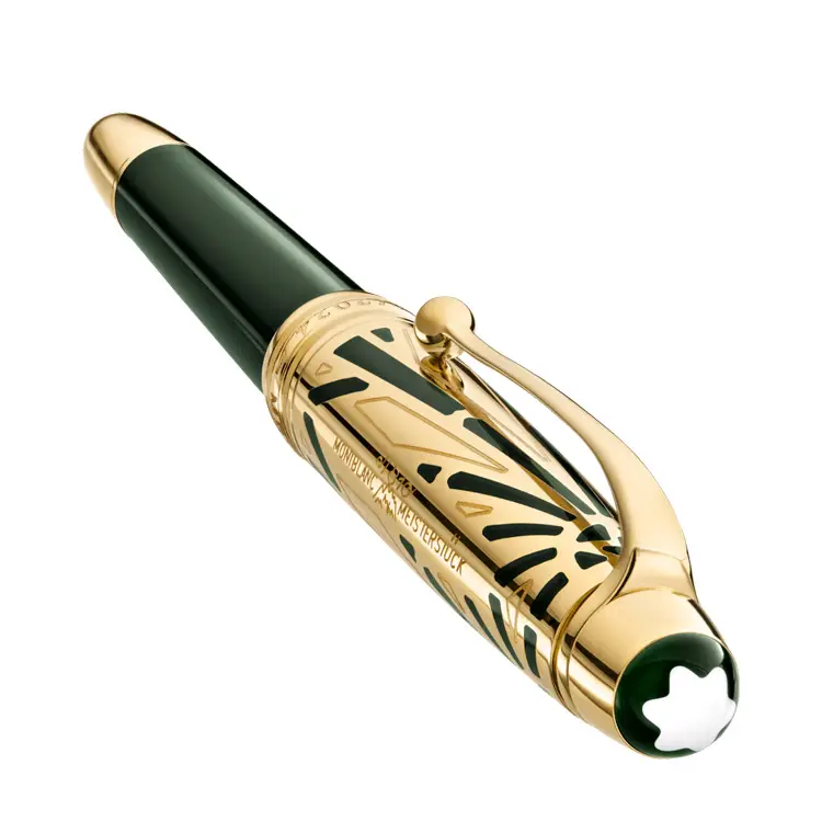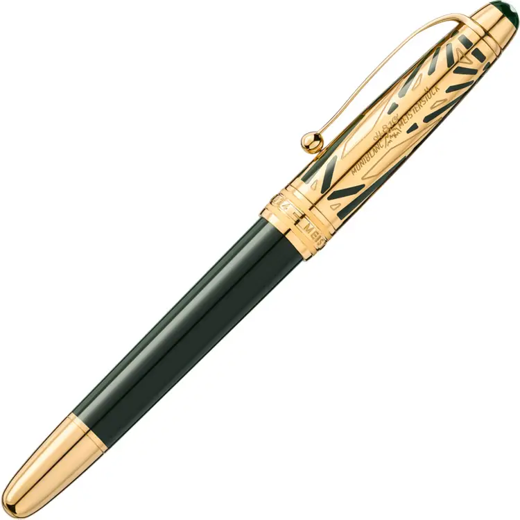 Der Korpus aus grünem kostbarem Harz harmoniert mit einer vergoldeten Kappe, die ein archivisches Muster in grünem Lack zeigt. Der vergoldete Clip verleiht dem Design einen klassischen, luxuriösen Charakter.