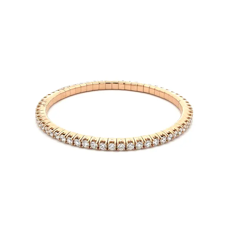 Das Tennisarmband Beny Jewellery aus Roségold verkörpert pure Eleganz und meisterhafte Goldschmiedekunst. Es besteht aus 59 rund geschliffenen Naturdiamanten mit einem Gesamtgewicht von 4,81 ct, die in einer fließenden Linie eingefasst sind und ein unvergleichliches Funkeln erzeugen. Das polierte 18 kt (750/1000) Roségold verleiht dem Schmuckstück einen warmen Glanz und eine luxuriöse Ausstrahlung.
