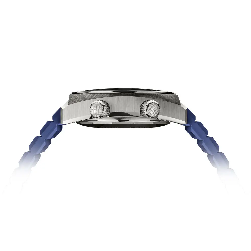 Das Gehäuse aus Titan Grad 5 (40,3 × 38 mm) ist widerstandsfähig und leicht, wasserdicht bis 200 m. Zwei Kronen steuern die innere Drehlünette und die Zeiteinstellung. Das Zifferblatt kombiniert Orange, Blau und Weiß mit auffälligen Leuchtelementen.