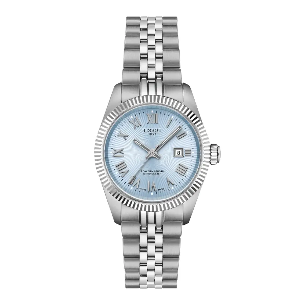Das ice-blue Zifferblatt ist mit römischen Ziffern, eleganten Zeigern und einem Datumsfenster bei 3 Uhr ausgestattet. Eine geriffelte Lünette und das fünfreihige Edelstahlarmband im „Jubilee“-Stil mit abwechselnd polierten und satinierten Oberflächen verleihen dem Modell einen luxuriösen und harmonischen Charakter. Die Kombination aus Edelstahl und sanften Blautönen wirkt modern, frisch und ausgesprochen feminin.