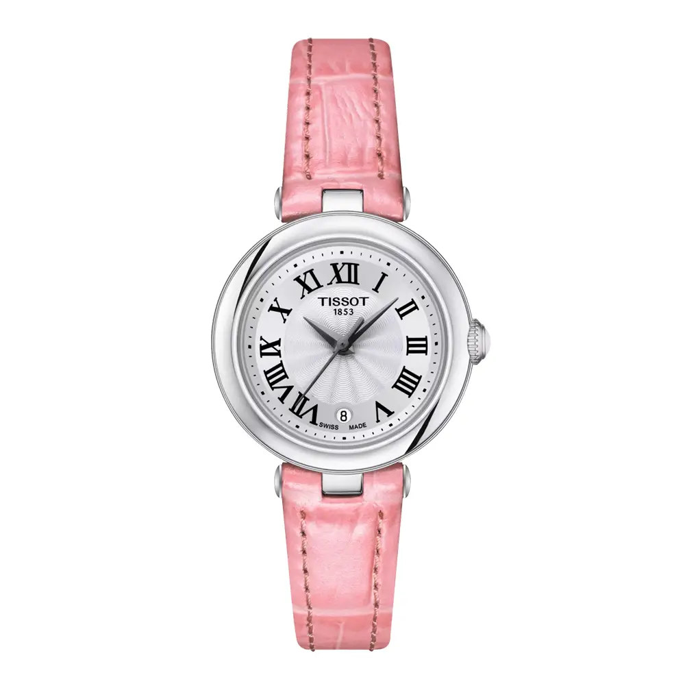 Die Tissot Bellissima Small Lady T126.010.16.013.01 vereint elegante Details mit traditioneller Schweizer Uhrmacherkunst. Das 26 mm Edelstahlgehäuse ist mit einem zarten rosafarbenen Lederarmband kombiniert, das einen femininen und stilvollen Look schafft. Das klare weiße Zifferblatt mit römischen Ziffern und Datumsanzeige bietet zeitlose Eleganz und Funktionalität.