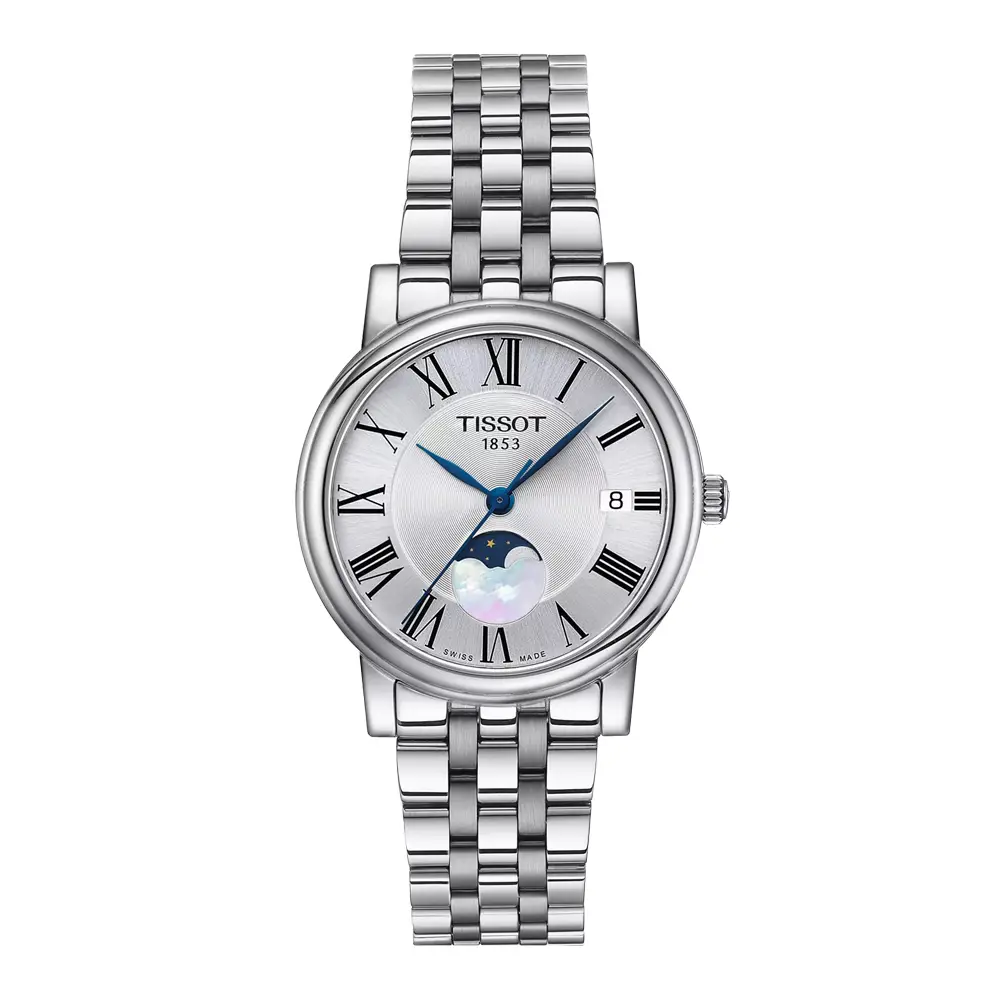 Die Tissot Carson Premium Lady Moonphase vereint zarte Ästhetik, zeitlose Eleganz und Schweizer Präzision zu einer Uhr, die sowohl im Alltag als auch zu besonderen Anlässen überzeugt. Das 32-mm-Gehäuse aus 316L-Edelstahl umrahmt ein ausgewogenes silbernes Zifferblatt mit römischen Zahlen und gebläuten Zeigern, das der Uhr ein klassisches und harmonisches Erscheinungsbild verleiht. Das Edelstahlarmband ergänzt das Design mit einem glänzenden, femininen Akzent.