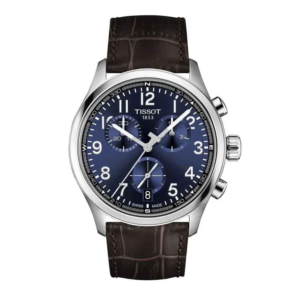 Das Highlight ist das blaue Zifferblatt mit arabischen Zahlen, das für hervorragende Ablesbarkeit sorgt. Zeiger mit Super-LumiNova® ermöglichen das Ablesen auch bei schlechten Lichtverhältnissen. Die Uhr verfügt über einen Chronographen (1/10 Sek., 30 Min.) mit zentraler Sekunde sowie eine Datumsanzeige. Der sportliche Look wird durch ein braunes Lederarmband mit Krokodilprägung und Schnellwechselsystem ergänzt.