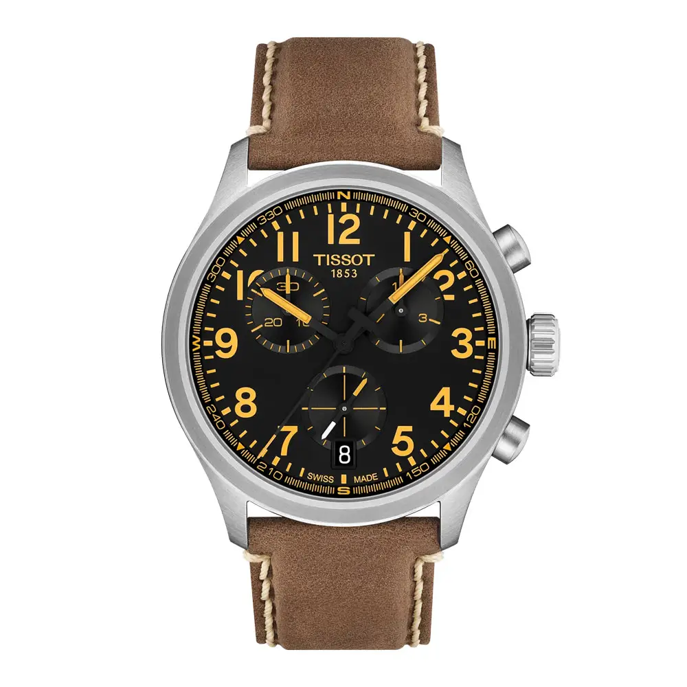 Das Highlight ist das schwarze Zifferblatt mit gelben Akzenten und arabischen Zahlen, das für hervorragende Ablesbarkeit sorgt. Zeiger mit Super-LumiNova® ermöglichen das Ablesen auch bei schlechten Lichtverhältnissen. Die Uhr verfügt über einen Chronographen (1/10 Sek., 30 Min.) sowie eine Datumsanzeige. Der sportliche Charakter wird durch ein beiges Lederarmband mit Kontrastnähten und Schnellwechselsystem unterstrichen.