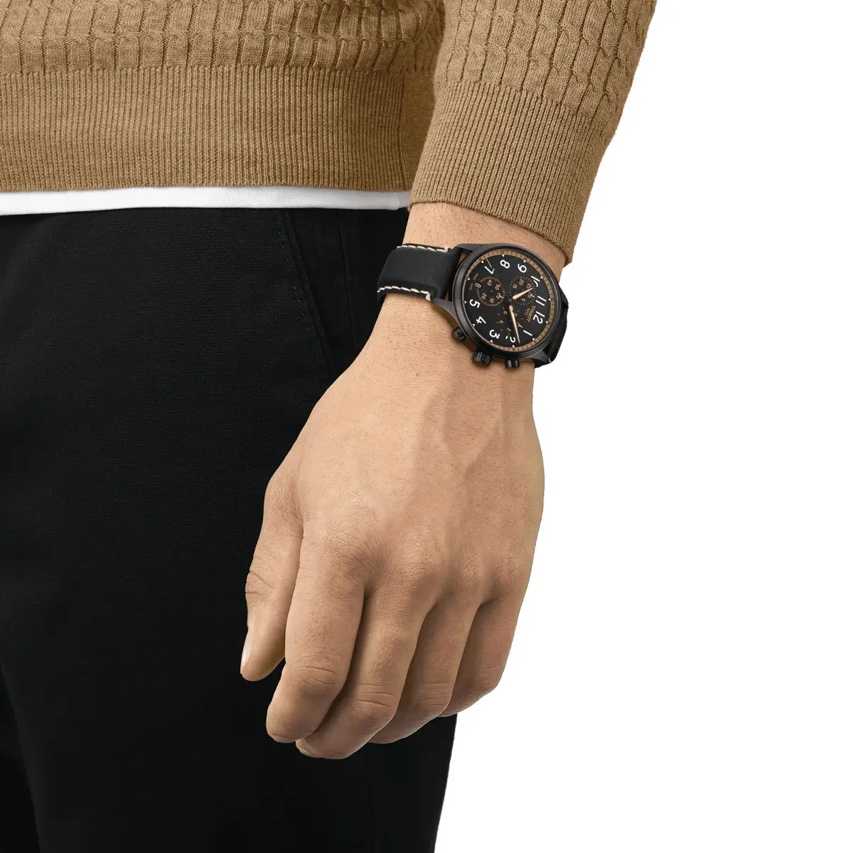 Die Tissot Chrono XL Vintage T116.617.36.052.02 vereint retro Eleganz, markanten Charakter und Schweizer Präzision. Das 45-mm-Edelstahlgehäuse mit schwarzer PVD-Beschichtung wird durch ein schwarzes Zifferblatt mit drei Chronographenzählern und beigen Zeigern und Indizes ergänzt, die dem Modell seinen Vintage-Look verleihen. Das braune Lederarmband mit Kontrastnaht sorgt für zeitlosen Stil und hohen Tragekomfort.