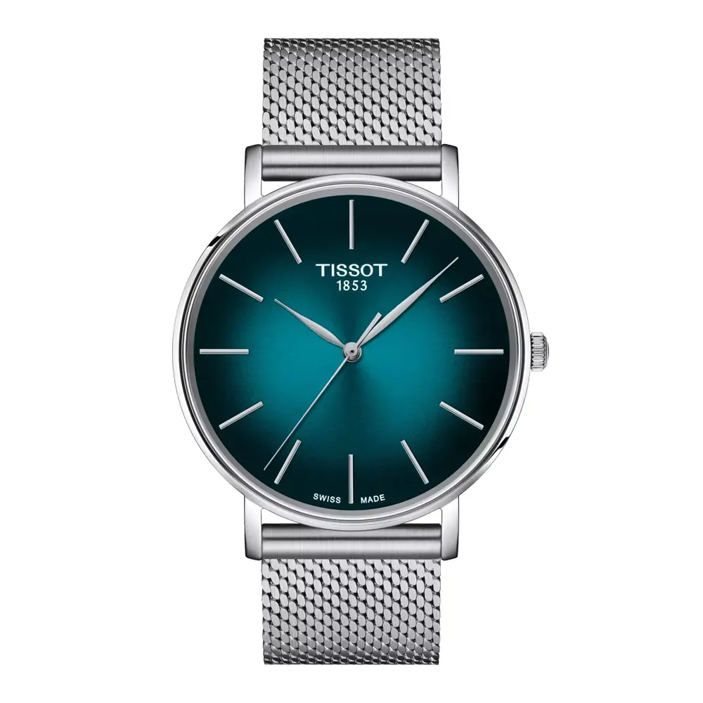 Die Tissot Everytime Gent (Ref. T143.410.11.091.00) vereint minimalistisches Design mit einem modernen, zeitlosen Ausdruck. Im Mittelpunkt steht ein grün-schwarz abgestuftes Zifferblatt, das einen feinen Lichteffekt und eine klare analoge Anzeige bietet. Geschützt wird es durch ein Saphirglas mit hoher Kratzfestigkeit, während das Edelstahl-Milanaiseband (Mesh) der Uhr eine elegante Dress-Note verleiht.
