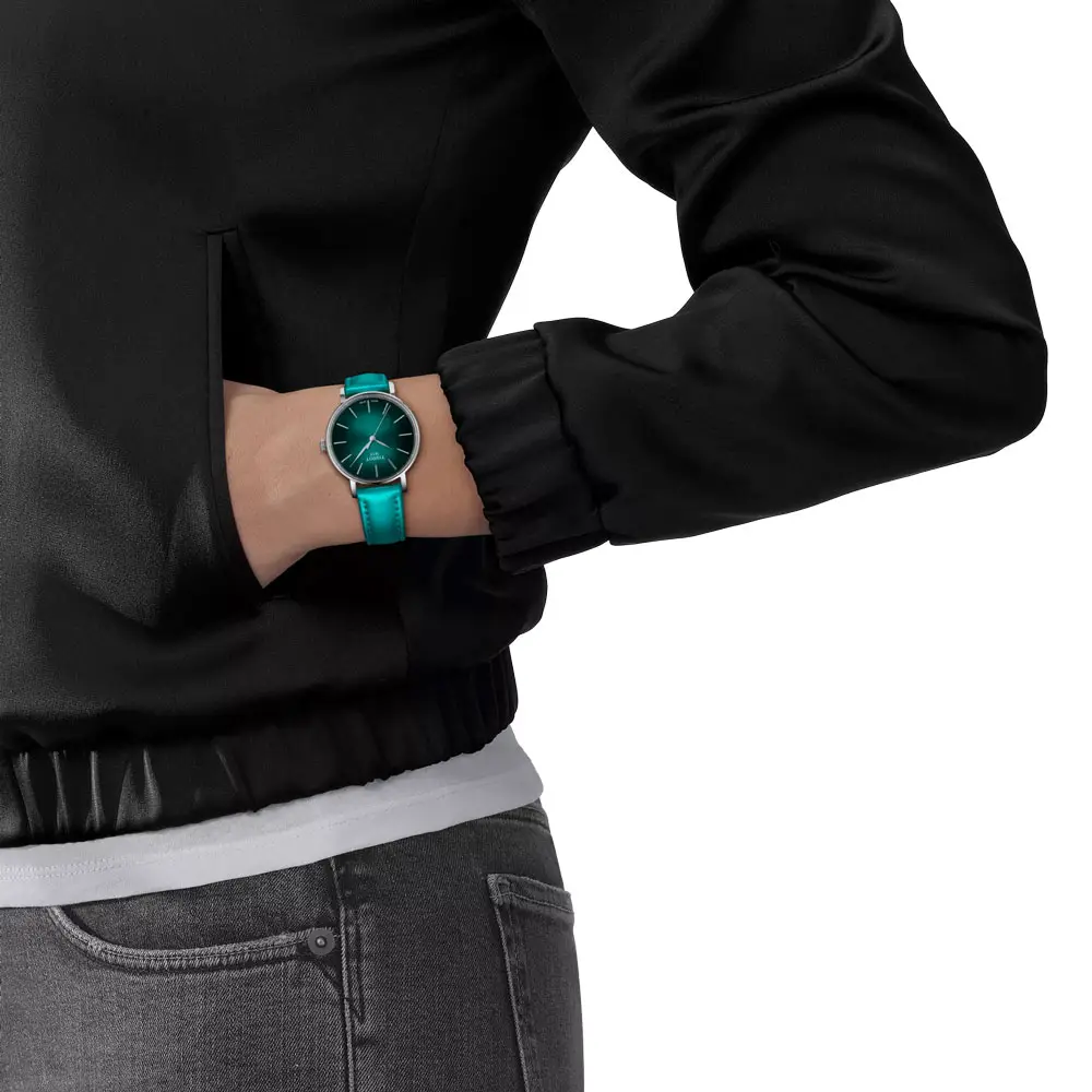 Die Tissot Everytime Lady T143.210.17.091.00 ist eine elegante Damenuhr aus der T-Classic Everytime Kollektion, die minimalistisches Design mit hochwertiger Schweizer Uhrmacherkunst verbindet. Ihr Edelstahlgehäuse (316L) mit 34 mm Durchmesser und das reizvolle türkisfarbene Zifferblatt werden durch ein kratzfestes Saphirglas geschützt.
