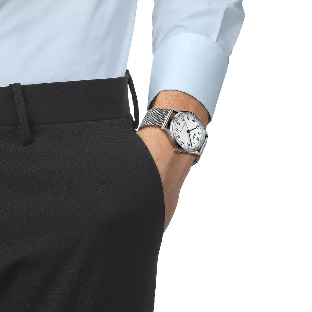 Die Tissot Heritage 1938 Automatic COSC würdigt die Schweizer Uhrmachertradition mit einem klaren, funktionalen Design. Das 39-mm-Edelstahlgehäuse, das silberne Zifferblatt mit feiner Textur und die Eisenbahn-Minuterie verleihen der Uhr eine elegante Vintage-Ausstrahlung, ergänzt durch arabische Ziffern und ein dunkles Lederband.