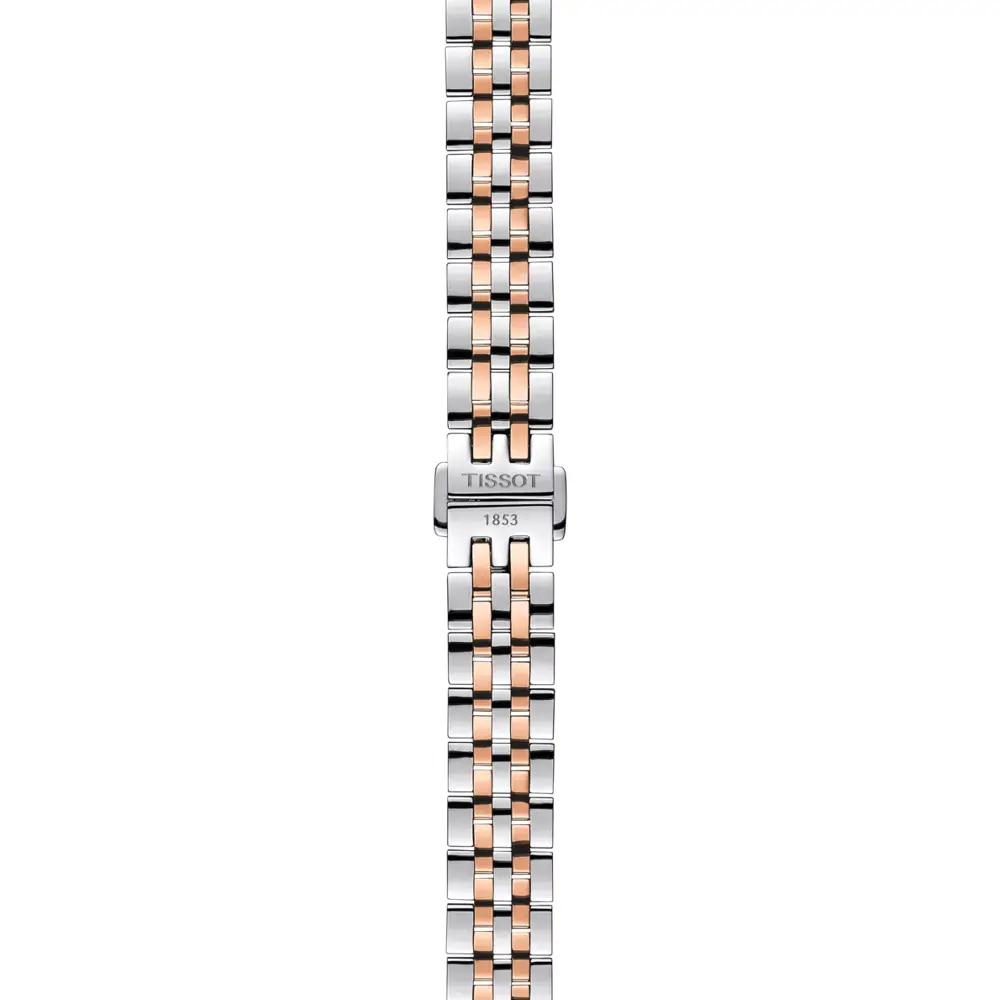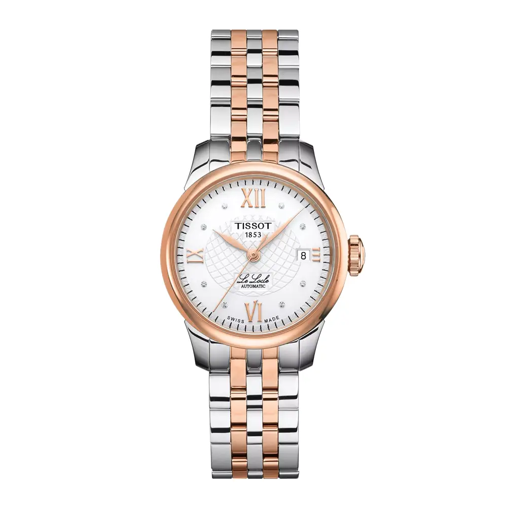 Die Tissot Le Locle Automatic Lady T41.2.183.16 verkörpert klassische Schweizer Eleganz und feine Details. Das kompakte 25,3-mm-Gehäuse mit roségoldener PVD-Beschichtung wirkt edel, während das silberne Zifferblatt mit römischen Zahlen und acht Diamanten zeitlose Weiblichkeit ausstrahlt. Abgerundet wird der Look durch ein hochwertiges braunes Lederarmband.