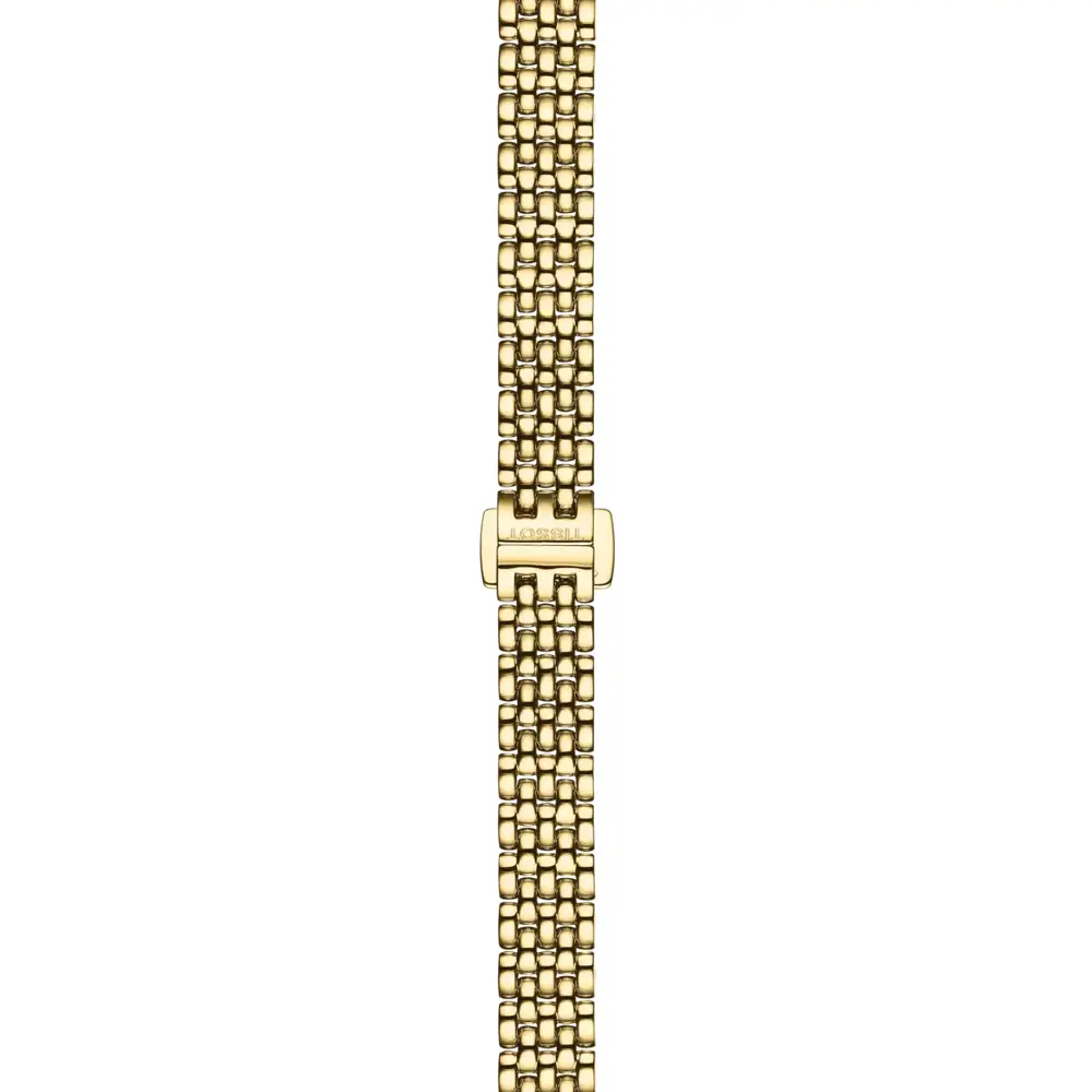 Pouzdro i náramek jsou vyrobeny z kvalitní nerezové oceli s luxusní úpravou v barvě žlutého zlata, která dodává modelu atraktivní a současně velmi ženský vzhled. Safírové sklíčko zajišťuje vysokou odolnost vůči poškrábání a zachovává dlouhodobou čistotu ciferníku. Díky úzkému profilu a lehké konstrukci se hodinky nosí s maximálním pohodlím.