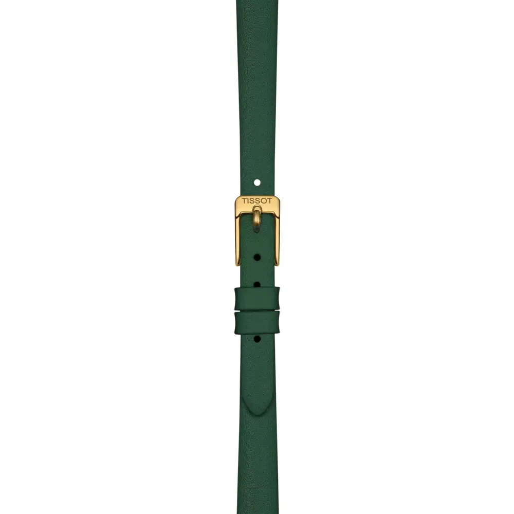 Diese eleganten Damenuhren aus der T-Lady – Lovely Kollektion verbinden ein klassisches, vom Vintage-Stil inspiriertes Design mit moderner Schweizer Uhrmacherkunst. Das runde Gehäuse mit einem Durchmesser von 19,5 mm besteht aus 316L Edelstahl mit goldener PVD-Beschichtung, die für hohe Haltbarkeit und ein luxuriöses Erscheinungsbild sorgt. Besonders hervorzuheben ist das grüne Sunray-Zifferblatt, das dezente Lichtreflexe erzeugt und der Uhr einen eleganten Charakter verleiht.