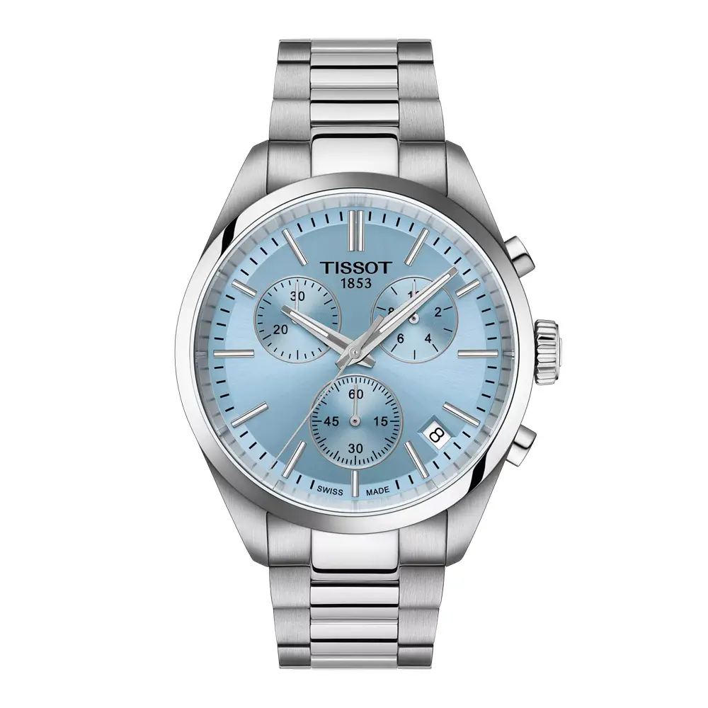 Die Tissot PR 100 Chronograph T150.417.11.351.00 ist eine moderne sportlich-elegante Uhr für Männer, die klare Linien, Vielseitigkeit und Schweizer Präzision schätzen. Das 40-mm-Gehäuse aus 316L-Edelstahl zusammen mit dem klassischen Edelstahlarmband verleiht der Uhr ein robustes, aber dennoch elegantes Erscheinungsbild. Der besondere Blickfang ist das hellblaue (Ice-Blue) Zifferblatt, das der Uhr einen frischen und zeitgemäßen Charakter verleiht.