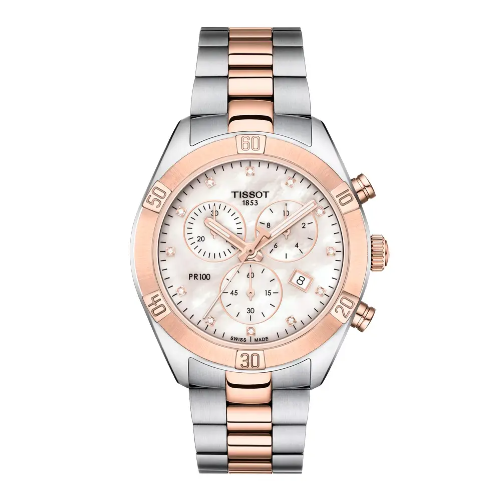Die Tissot PR 100 Sport Chic Chronograph T101.917.22.116.00 vereint sportliche Eleganz, luxuriöse Details und Schweizer Präzision. Ihr 38-mm-Edelstahlgehäuse (316L) mit roségoldener PVD-Beschichtung wird durch ein Perlmuttzifferblatt mit 12 Diamantindizes ergänzt, das feminine Raffinesse und Glanz ausstrahlt.