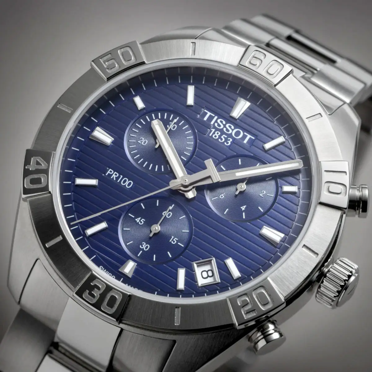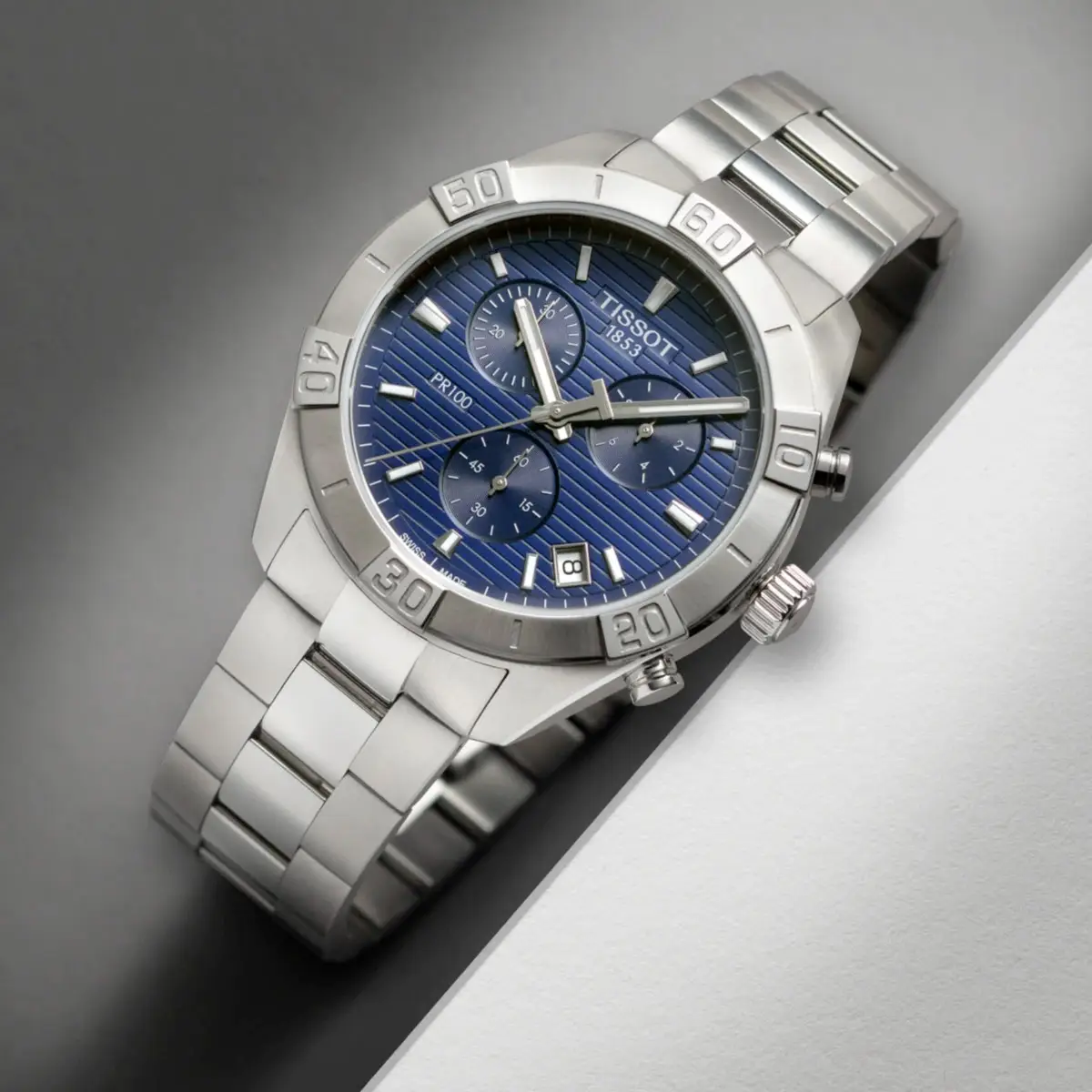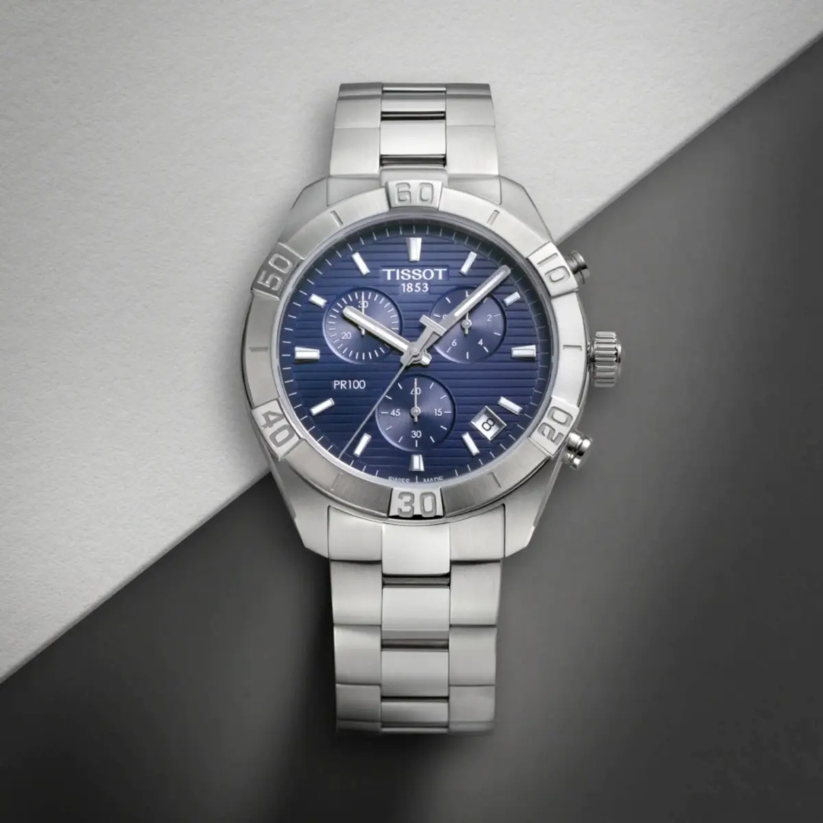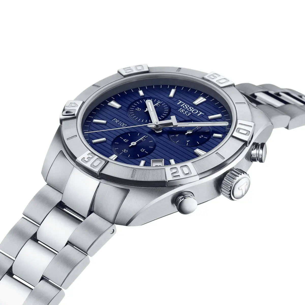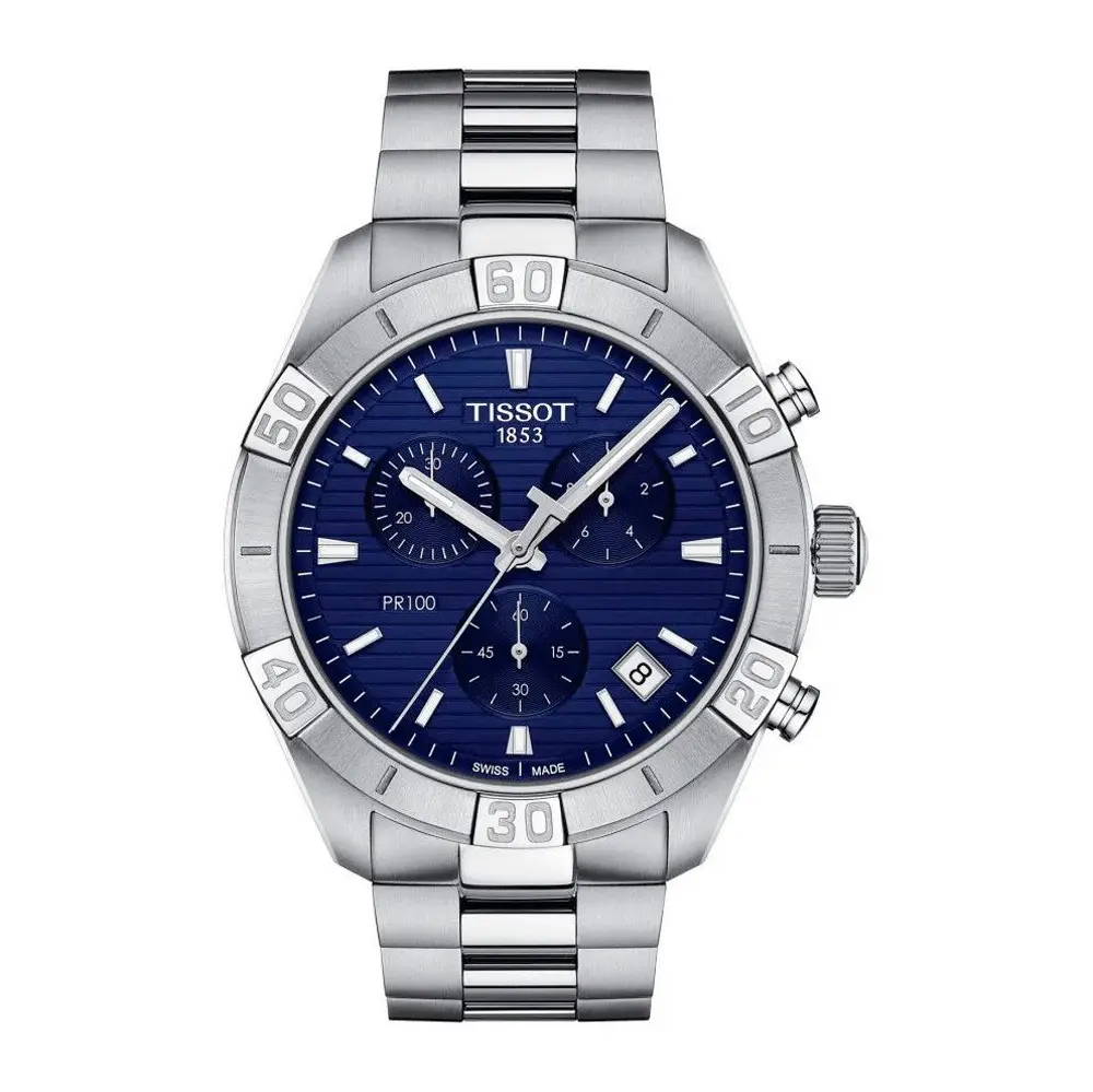 Die Tissot PR 100 Sport Gent Chronograph T101.617.11.041.00 ist ein sportlich-elegantes Modell, das alltagstaugliche Vielseitigkeit mit der Präzision der schweizer Uhrmacherkunst verbindet. Das runde Edelstahlgehäuse (44 mm) wird durch kratzfestes Saphirglas geschützt und mit einer Edelstahl-Lünette abgerundet. Das Design wird durch ein blaues analoges Zifferblatt mit Datumsanzeige und drei Chronographen-Zählern betont.