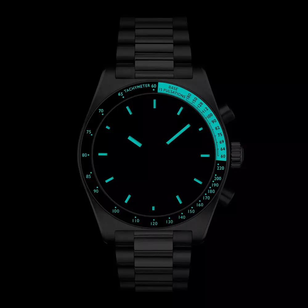 Das 40-mm-Gehäuse aus 316L-Edelstahl wird durch kratzfestes Saphirglas mit Antireflex-Beschichtung geschützt. Die Uhr verfügt über eine Tachymeterskala zur Geschwindigkeitsmessung sowie 100 m (10 ATM) Wasserdichtigkeit, was sich für Schwimmen und den täglichen Gebrauch eignet. Das Edelstahlarmband mit Faltschließe gewährleistet sicheren und komfortablen Sitz.