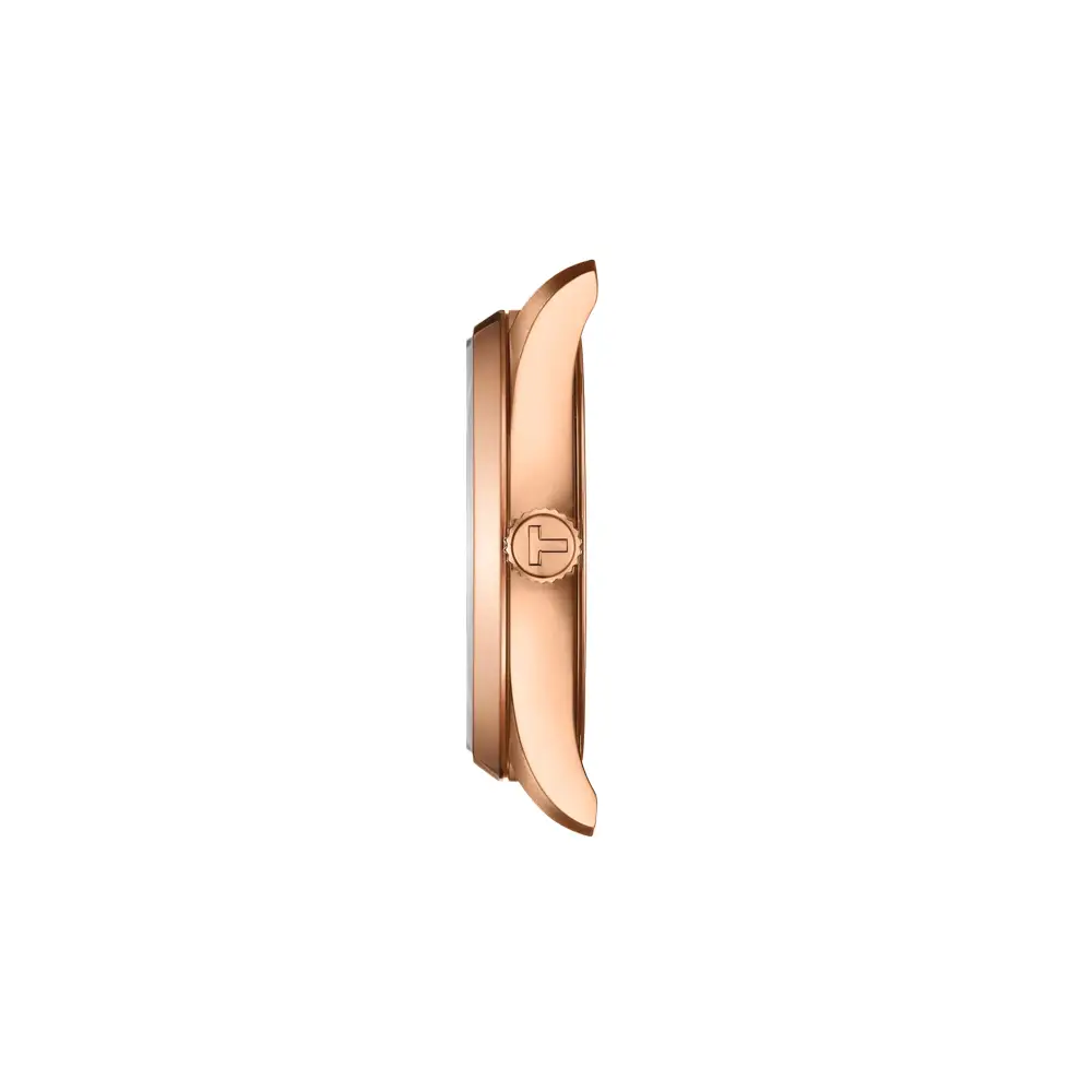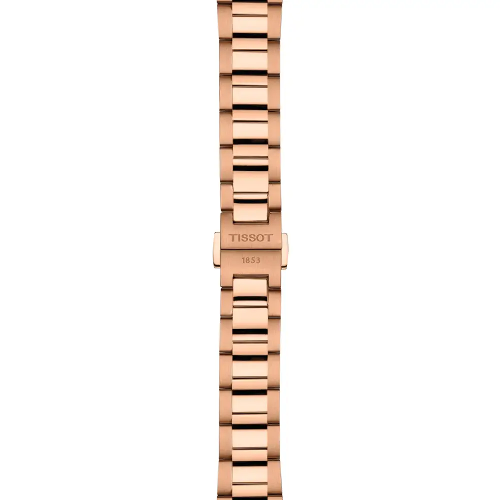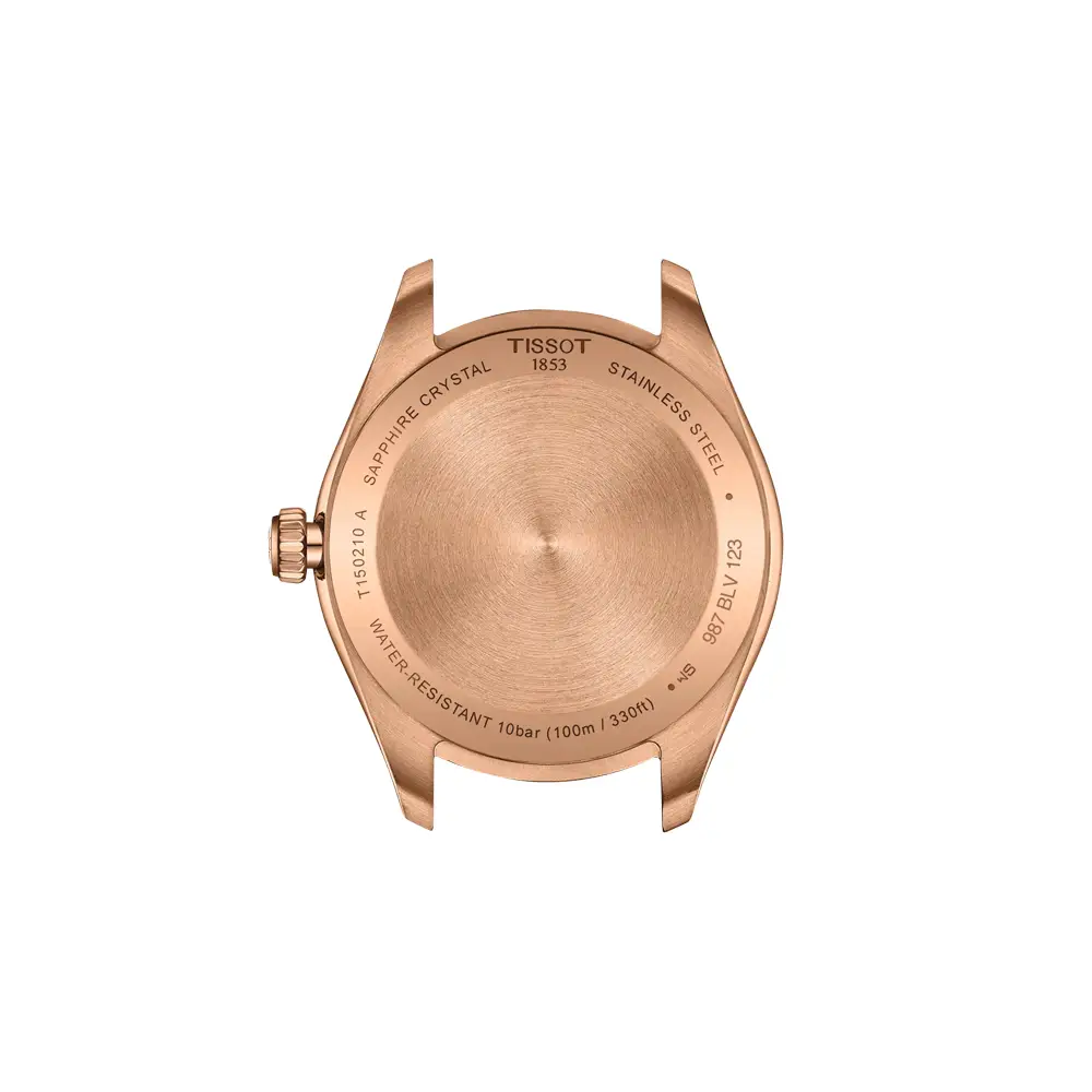 Die Tissot PR 100 Lady präsentiert sich mit einem 34-mm Edelstahlgehäuse und roségoldener PVD-Beschichtung, die eine moderne, elegante Interpretation der klassischen Damenuhr bieten. Saphirglas, 316L-Edelstahl und eine Wasserdichtigkeit von 100 m (10 bar) sorgen für hohe Robustheit im Alltag wie auch bei aktiveren Aktivitäten.