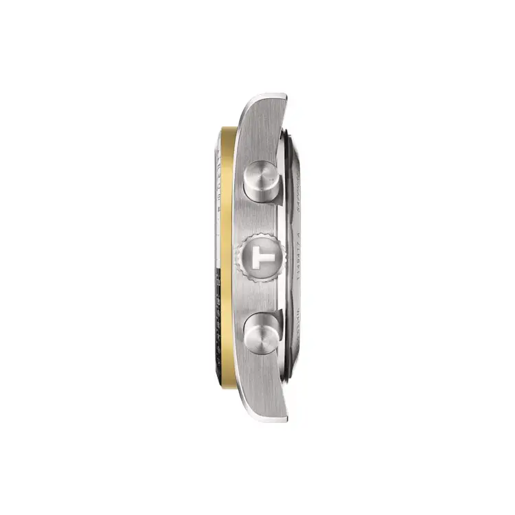 Die Tissot PR516 Chronograph ist ein sportlich-elegantes Modell, das das Erbe der ikonischen Rennsportuhren der 70er-Jahre mit modernem Schweizer Uhrmacherhandwerk verbindet. Das runde Edelstahlgehäuse mit 40 mm Durchmesser wird durch eine stilvolle Lünette aus Stahl mit Gelbgoldbeschichtung ergänzt und von einem kratzfesten Saphirglas geschützt, das perfekte Ablesbarkeit garantiert.