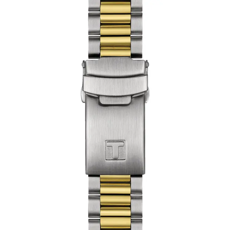 Das schwarze analoge Zifferblatt mit Chronograph und Datumsanzeige unterstreicht den sportlichen Charakter und die Funktionalität. Abgerundet wird das Modell durch ein elegantes Bicolor-Armband aus Edelstahl und Gelbgoldbeschichtung mit Faltschließe, das Luxus und Tragekomfort vereint.
