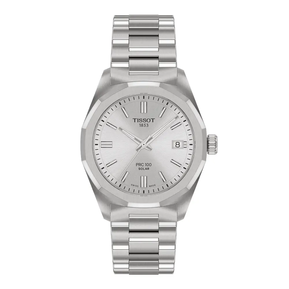 Die Tissot PRC 100 Solar im kompakten 34-mm-Format bietet ein modernes, klares Design und hohe Widerstandsfähigkeit. Das 316L-Edelstahlgehäuse, Saphirglas und eine Wasserdichtigkeit von 100 m (10 bar) machen sie zu einer zuverlässigen Begleiterin für den Alltag und für sportlichere Aktivitäten. Das Edelstahlarmband mit Faltschließe und Schnellwechselsystem sorgt für Komfort und Vielseitigkeit.