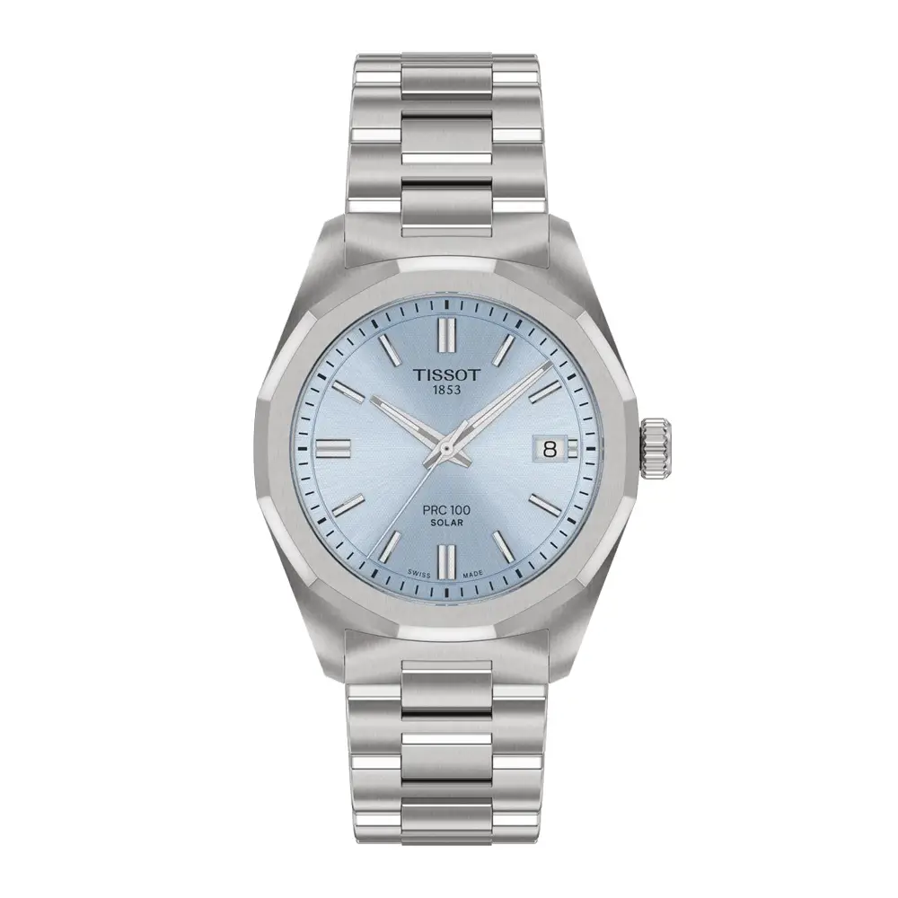 Die Tissot PRC 100 Solar im kompakten 34-mm-Format vereint sportliche Eleganz mit moderner Solartechnologie. Das 316L-Edelstahlgehäuse, Saphirglas und eine Wasserdichtigkeit von 100 m (10 bar) machen dieses Modell zu einer robusten und praktischen Wahl für den Alltag wie auch für einen aktiveren Lebensstil. Das Edelstahlarmband mit Faltschließe und Schnellwechselsystem sorgt für hohen Tragekomfort und Vielseitigkeit.
