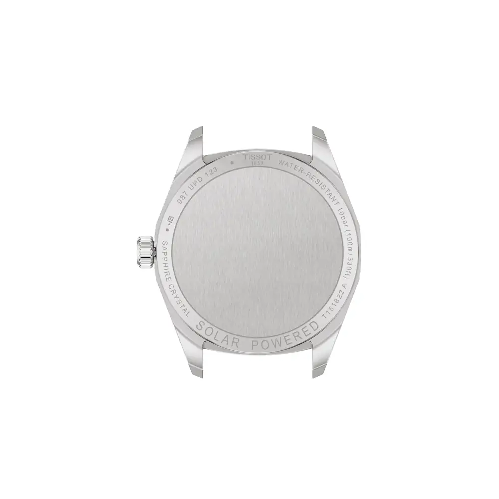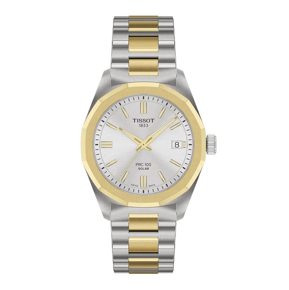 Die Tissot PRC 100 Solar 34 mm (Ref. T151.822.22.031.00) ist eine moderne Damenuhr, die elegantes Design mit innovativer Solartechnologie verbindet. Das 34 mm Gehäuse aus 316L Edelstahl mit goldfarbener PVD-Beschichtung wird durch eine markante zwölfeckige Lünette ergänzt. Die Uhr ist mit einem kratzfesten Saphirglas sowie einer Wasserdichtigkeit von 100 m (10 ATM) ausgestattet.