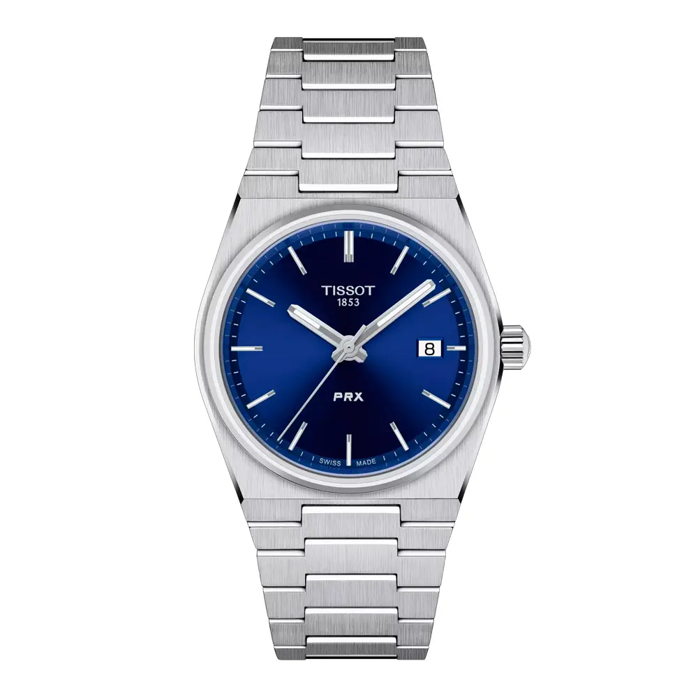 Die Tissot PRX 35mm T137.210.11.041.00 verkörpert das ikonische Retrodesign der 1970er-Jahre in moderner Interpretation. Das 35 mm Gehäuse aus 316L-Edelstahl ist mit kratzfestem Saphirglas ausgestattet und schützt das blaue Zifferblatt mit Sonnenschliff, das Tiefe und Eleganz ausstrahlt. Silberfarbene Indizes und Zeiger mit Super-LumiNova® sorgen für optimale Ablesbarkeit bei jedem Licht.