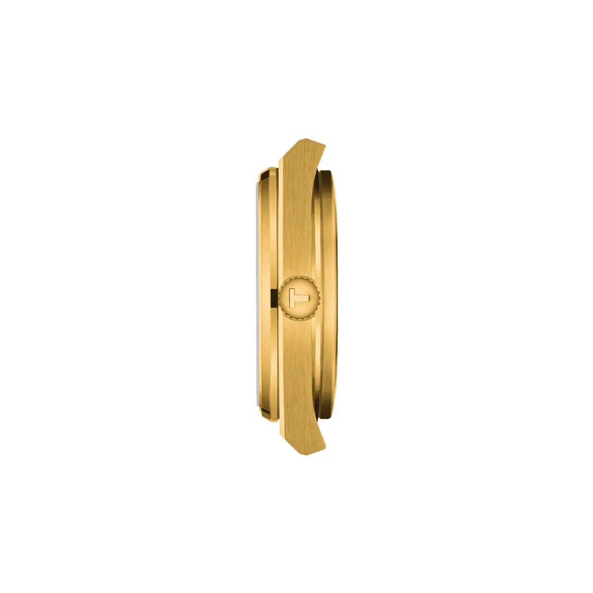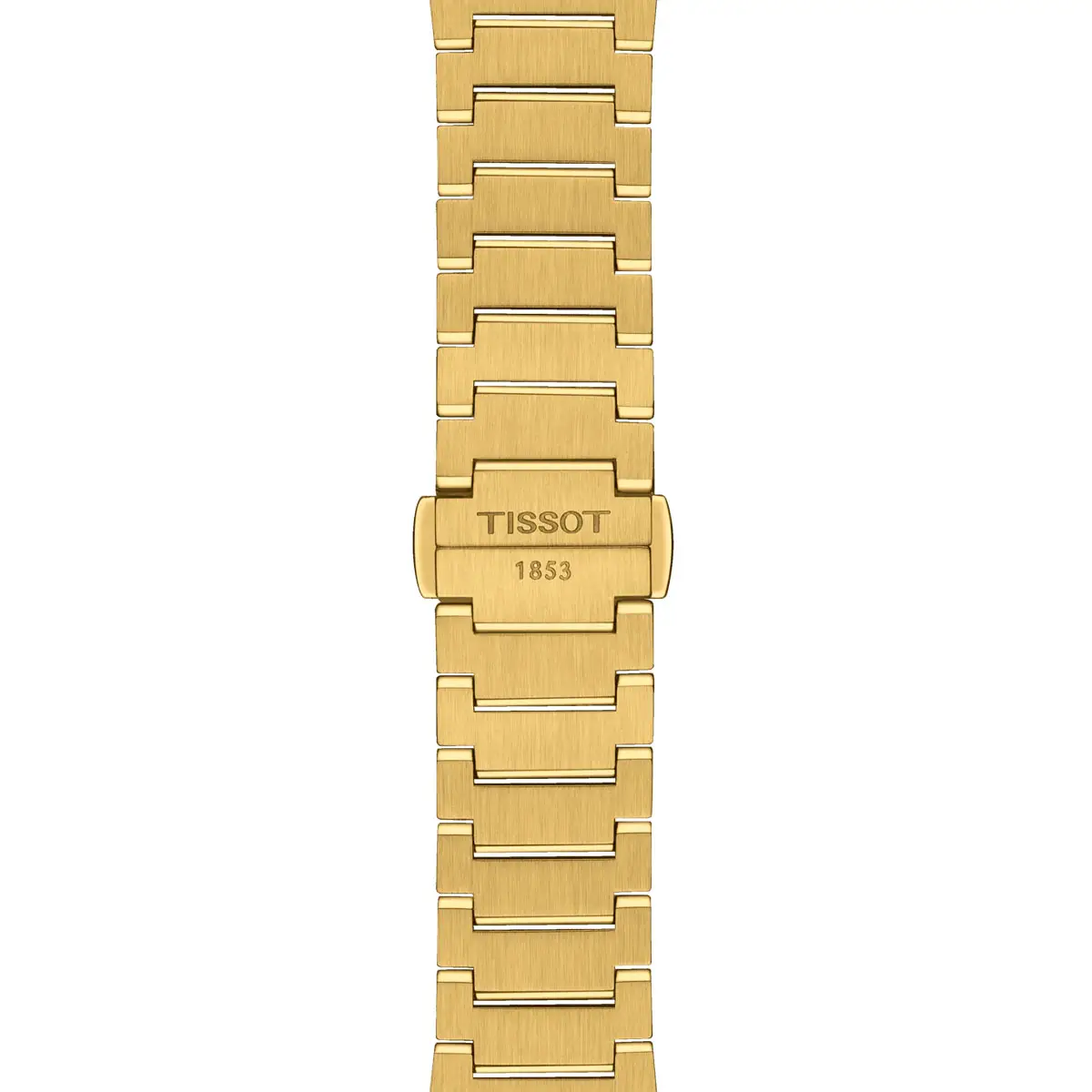 Die Tissot PRX 35mm T137.210.33.021.00 ist ein elegantes Damenmodell, das sich durch luxuriöse Optik und Schweizer Präzision auszeichnet. Das runde Edelstahlgehäuse mit gelbgoldener PVD-Beschichtung (35 mm Durchmesser) wird durch ein robustes Saphirglas geschützt, unter dem sich ein strahlendes goldenes Zifferblatt mit minimalistischem Design befindet. Eine praktische Datumsanzeige bei 3 Uhr erhöht die Alltagstauglichkeit.