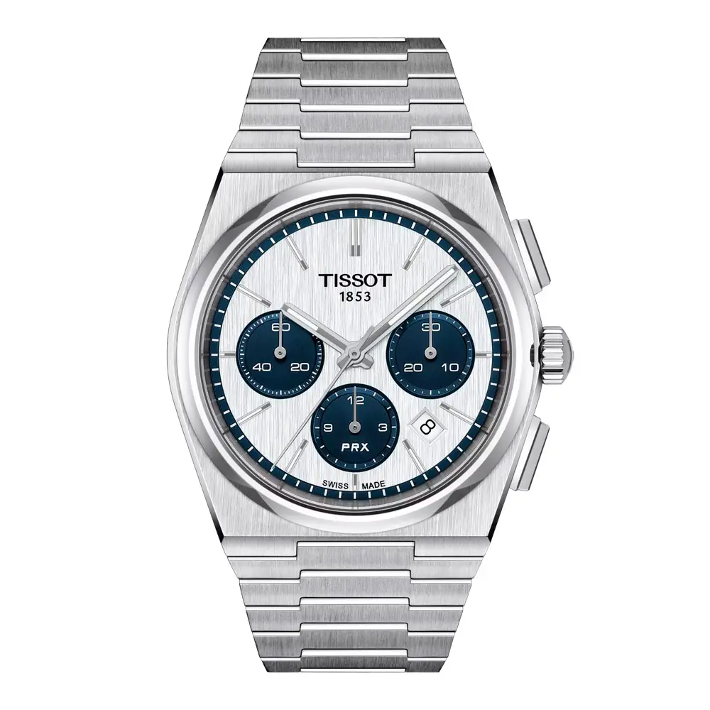 Die Tissot PRX Automatic Chronograph T137.427.11.011.01 ist ein sportlich-elegantes Modell, das präzise Schweizer Handwerkskunst mit zeitlosem Design vereint. Das runde Edelstahlgehäuse mit 42 mm Durchmesser wird durch ein robustes Saphirglas geschützt, das zuverlässig vor Kratzern bewahrt. Das silberne Zifferblatt mit kontrastierenden Totalisatoren bietet Chronographenfunktionen und eine Datumsanzeige für maximale Funktionalität.