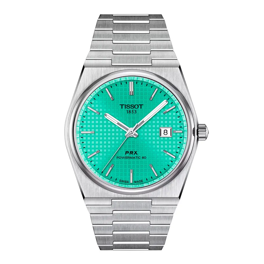Die Tissot PRX Powermatic 80 40 mm in Türkis ist eine moderne Neuinterpretation des ikonischen Designs der 70er-Jahre und verbindet zeitlose Ästhetik mit neuester Schweizer Technologie. Das runde Edelstahlgehäuse mit 40 mm Durchmesser und eleganter Lünette wird von einem kratzfesten Saphirglas geschützt, das hohe Widerstandsfähigkeit und perfekte Ablesbarkeit garantiert.